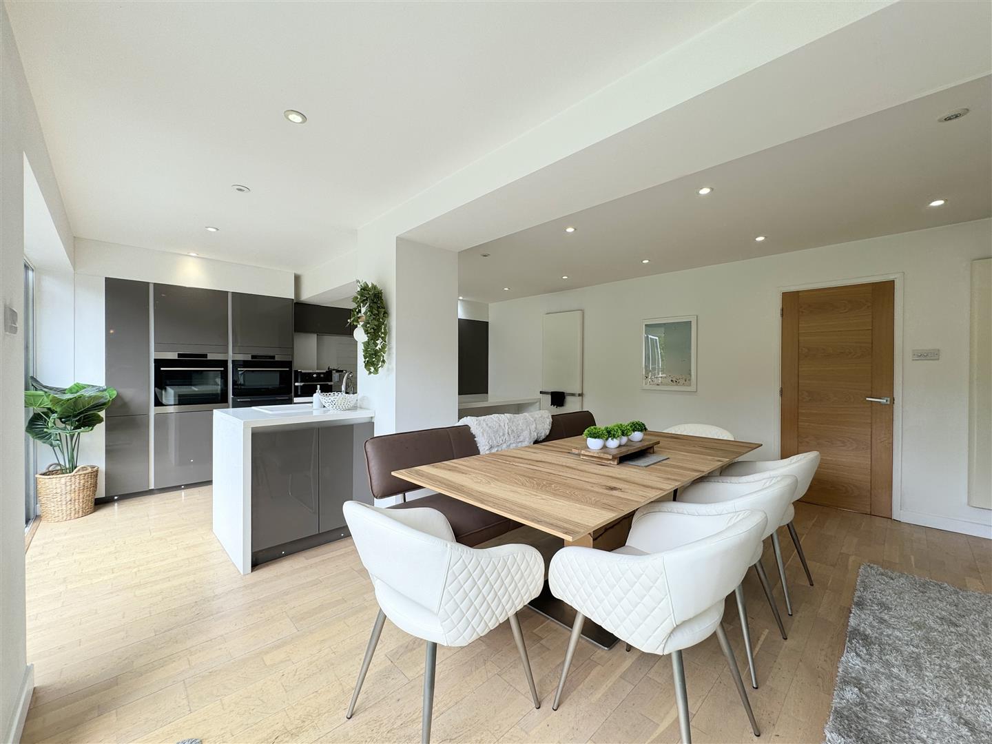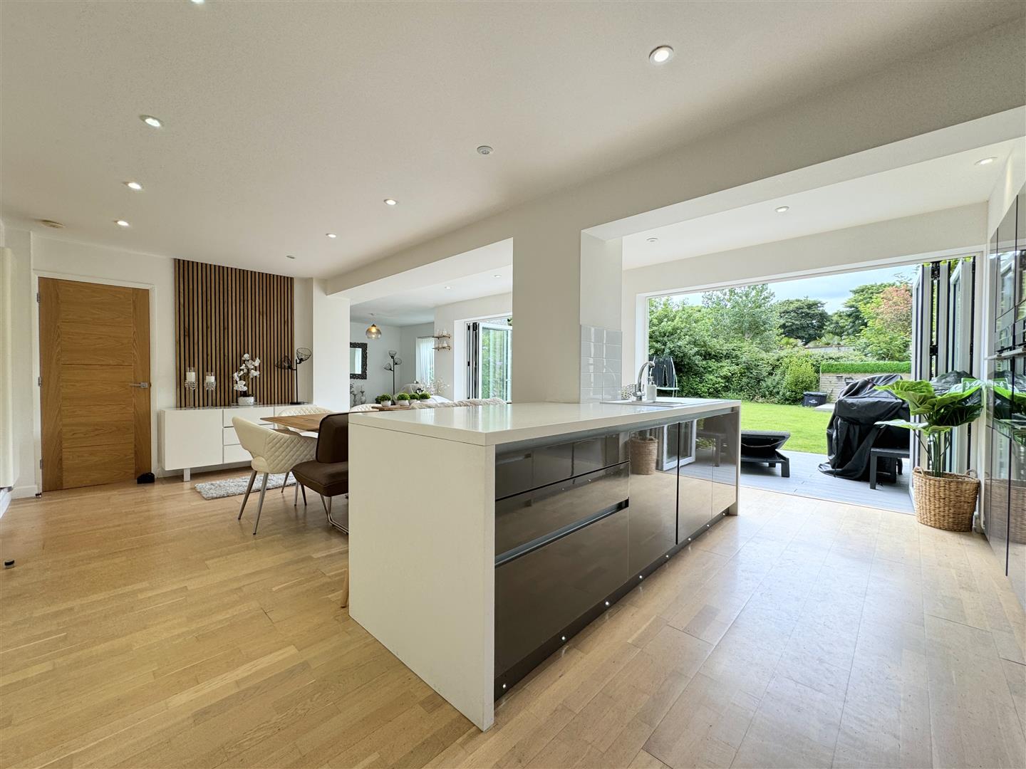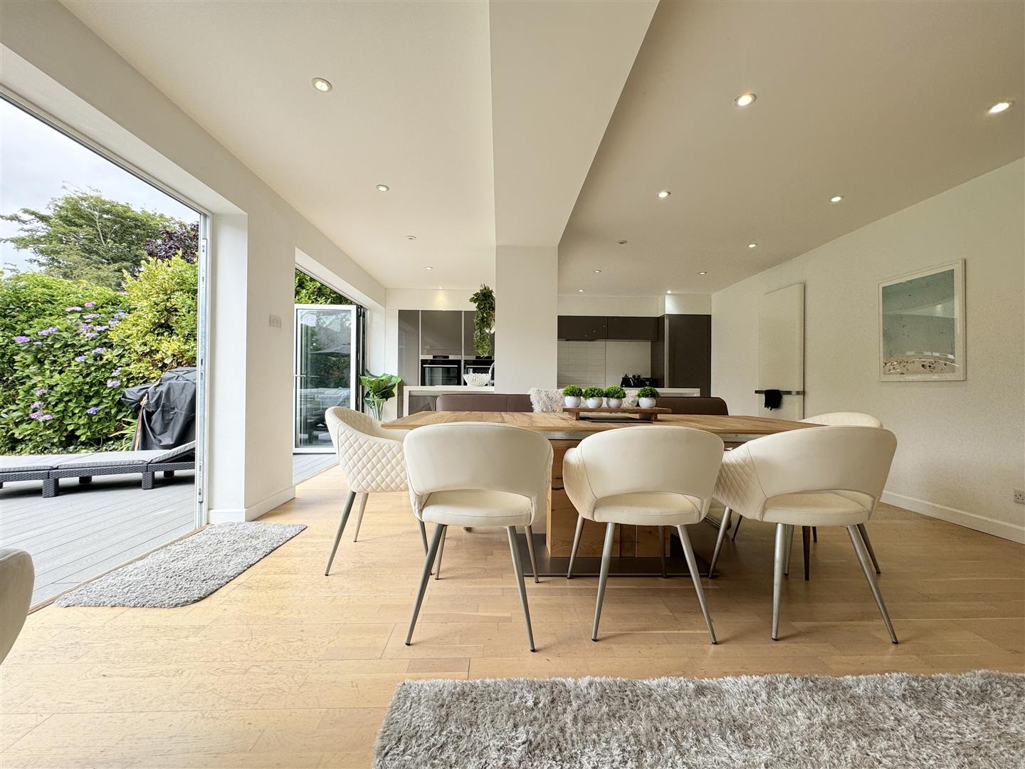 At the rear, the open-plan kitchen/diner/snug is an exceptional, family-friendly space with a real sense of luxury. When reconfiguring the home, the current owners were keen to create a space that could effortlessly bring everyone together—and they have achieved exactly that. There is ample room for cooking, dining and relaxing, and with the bi-fold doors open, the patio becomes a seamless extension of the living space—perfect for entertaining.