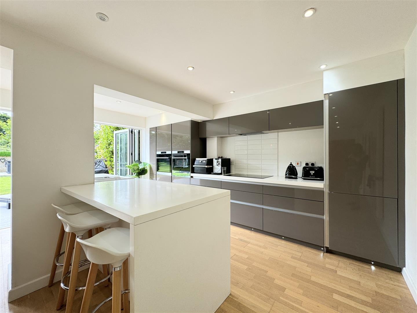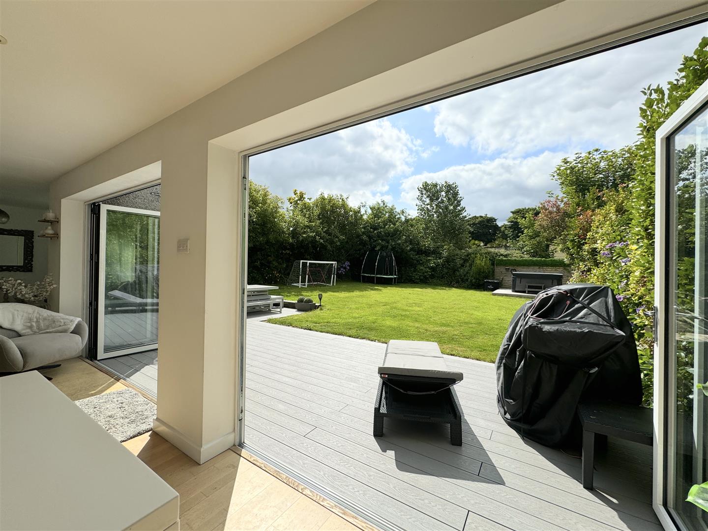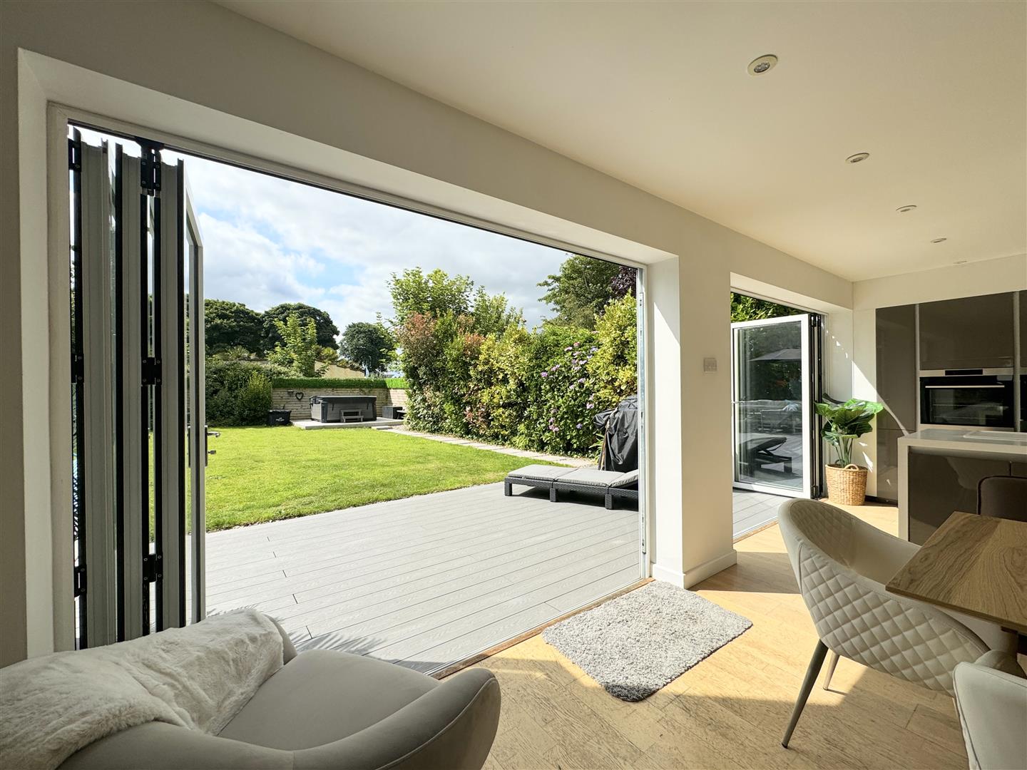 At the rear, the open-plan kitchen/diner/snug is an exceptional, family-friendly space with a real sense of luxury. When reconfiguring the home, the current owners were keen to create a space that could effortlessly bring everyone together—and they have achieved exactly that. There is ample room for cooking, dining and relaxing, and with the bi-fold doors open, the patio becomes a seamless extension of the living space—perfect for entertaining.