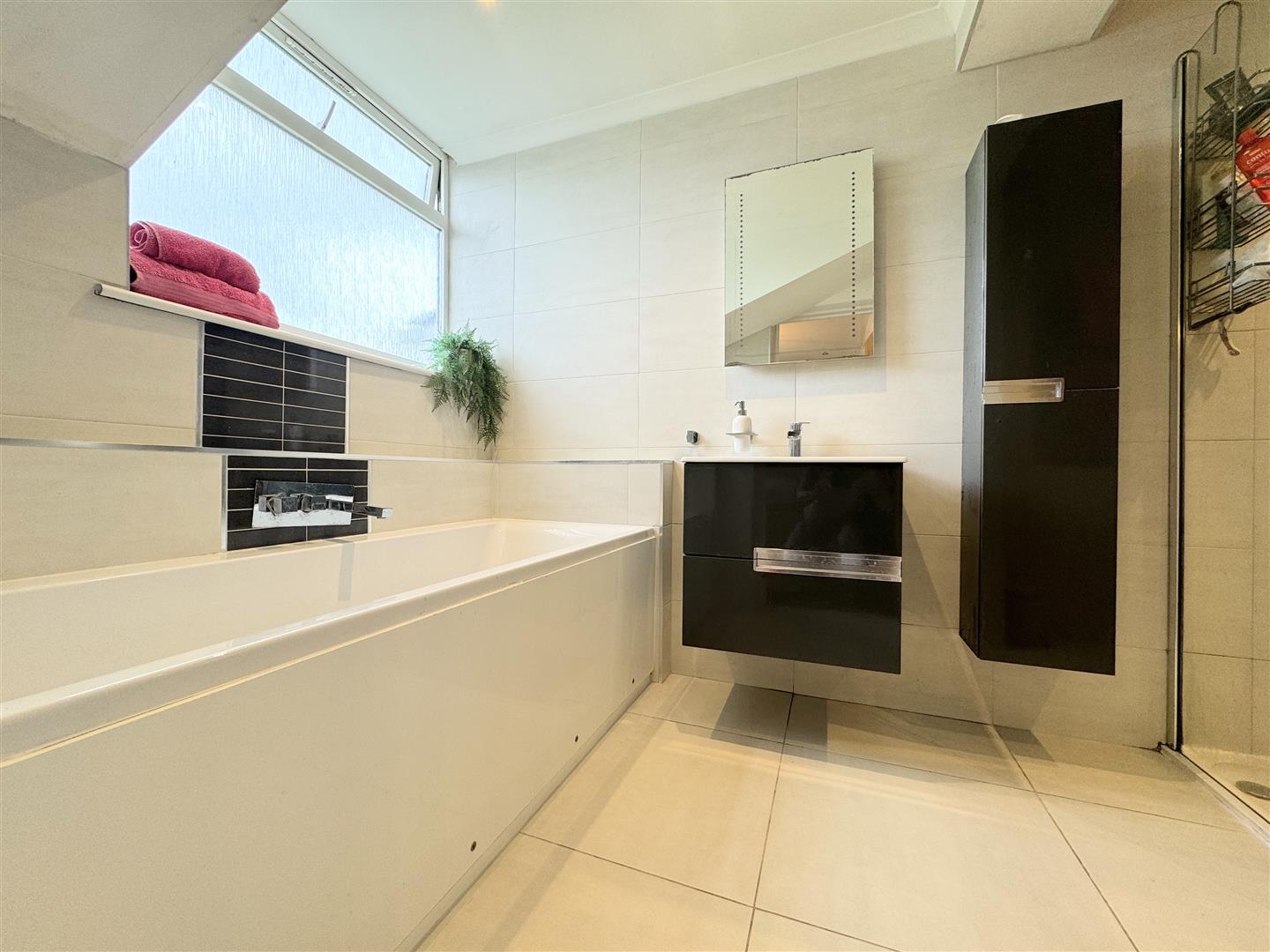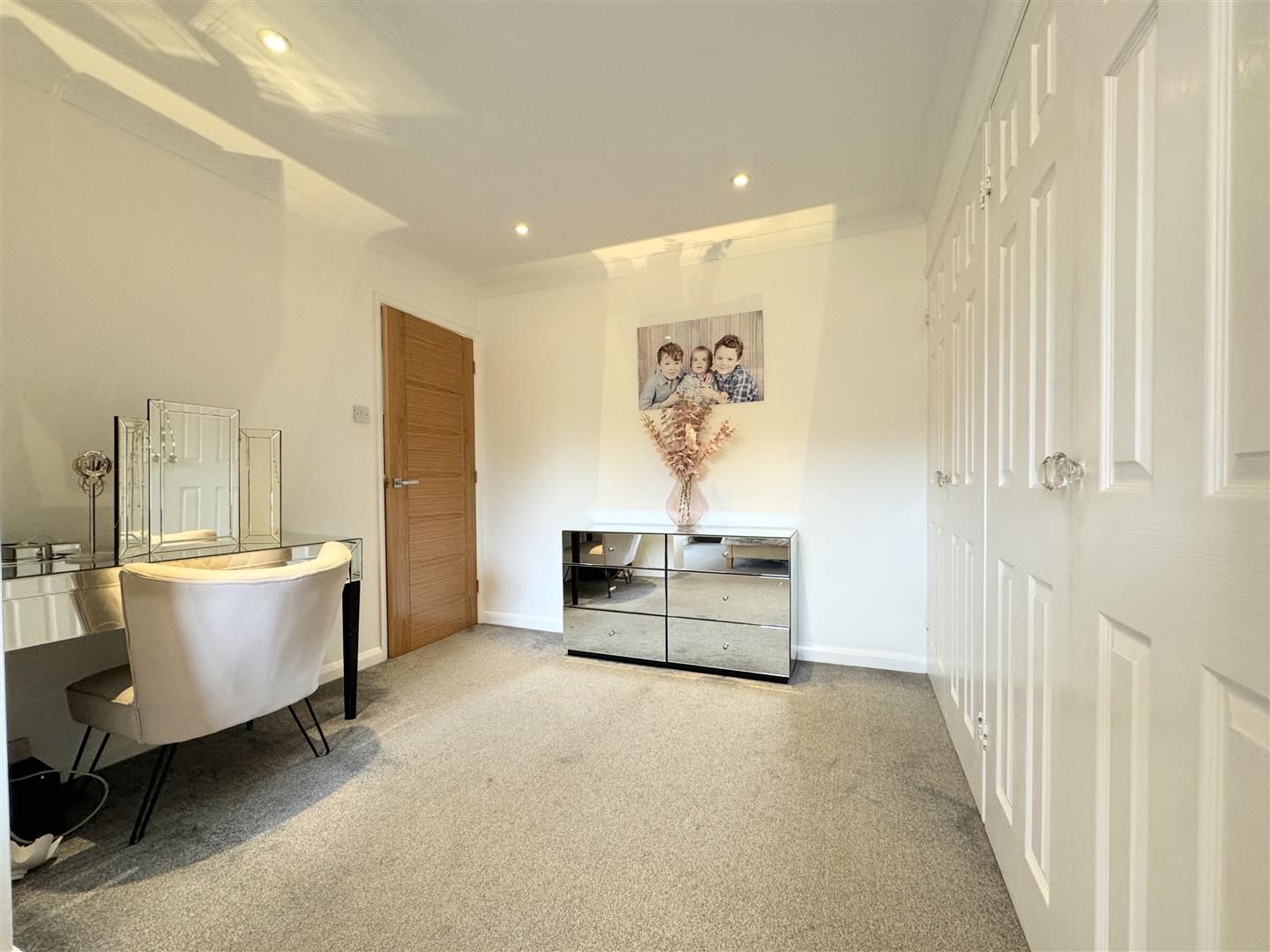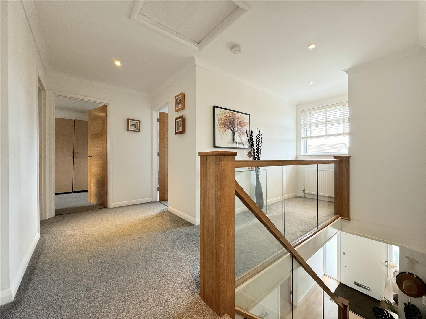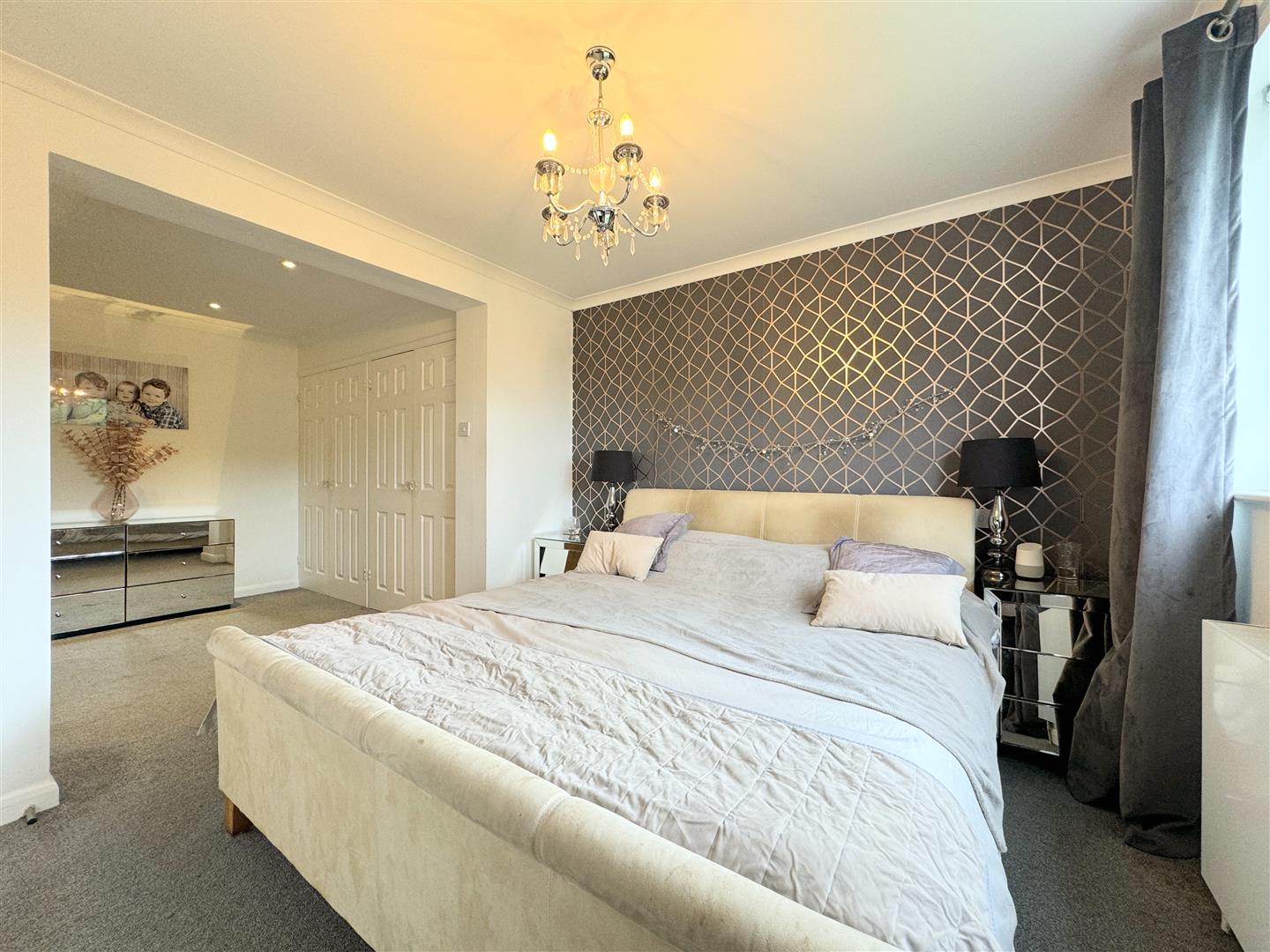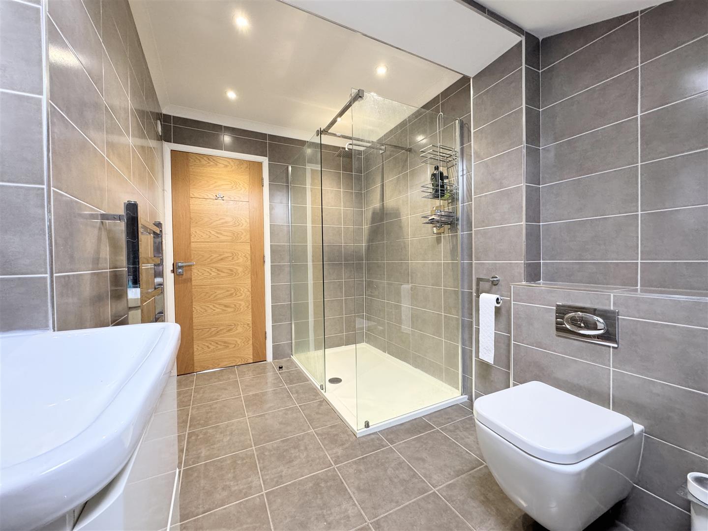 All four double bedrooms are located on the first floor, accessed from the spacious landing. The principal bedroom suite features a window to the rear, plenty of built-in storage, and an en-suite shower room. The second bedroom, located at the front, includes an airing cupboard housing the high-pressure water tank, while the remaining two bedrooms are both generously sized. The family bathroom, also on the first floor, is fully tiled, bright and spacious, and features a bath along with a separate double shower.