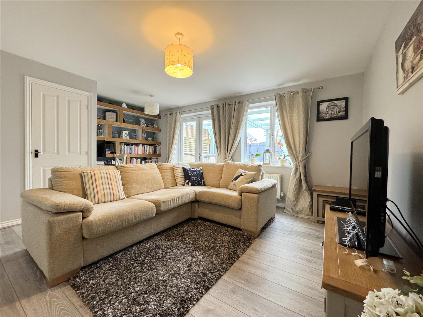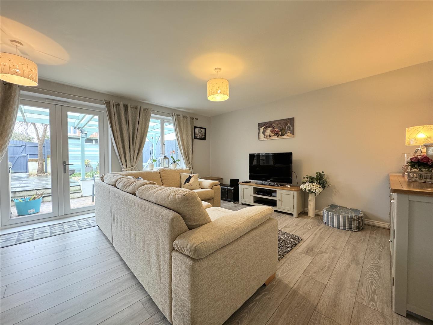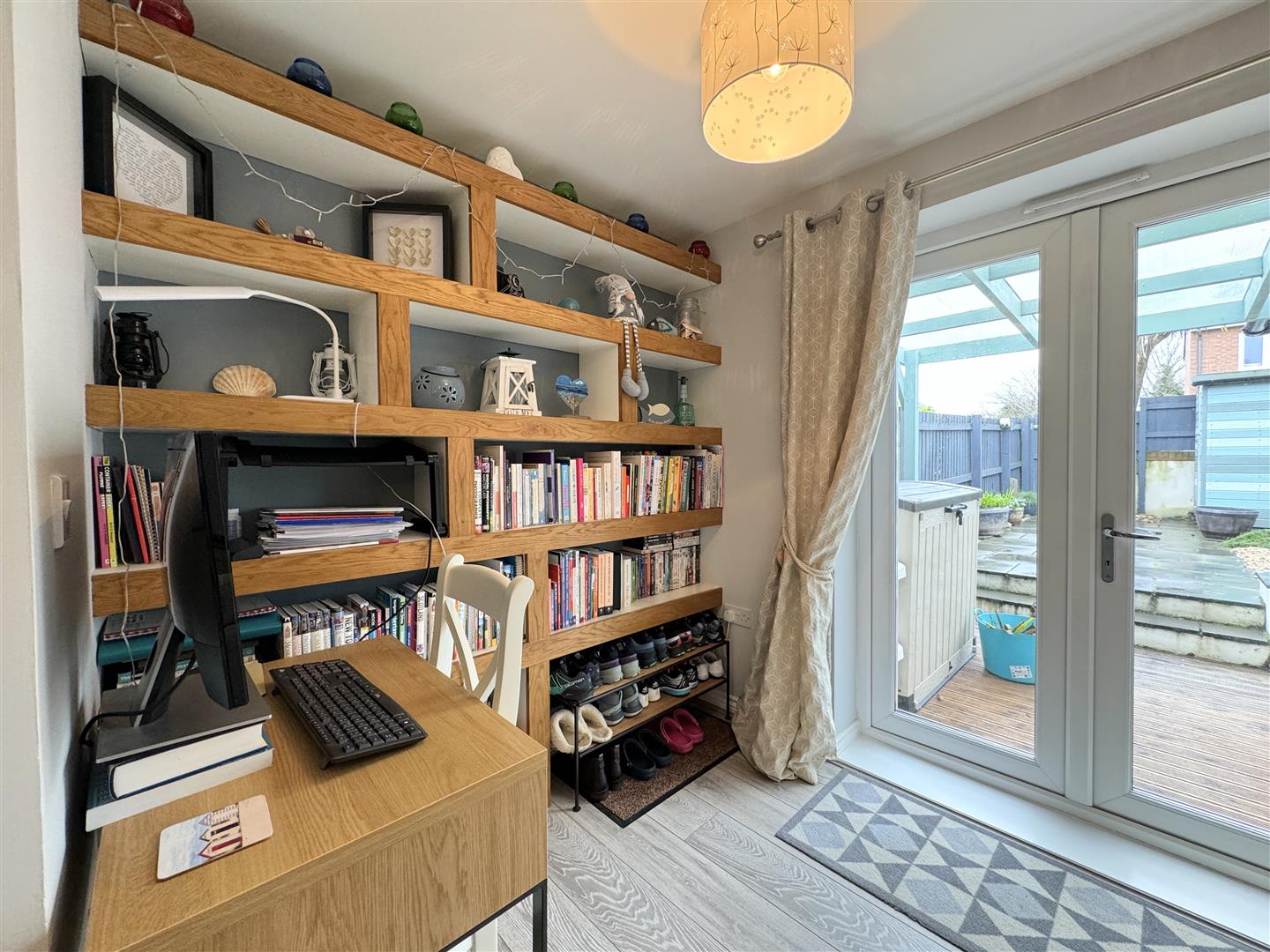 The lounge at the rear is spacious and decorated in modern, light colours with French doors giving access to the garden. This is a great family room with ample space for plenty of furniture. Within the lounge there is a large storage cupboard. The current owners have created a 'work from home' area with bespoke shelving in the corner.