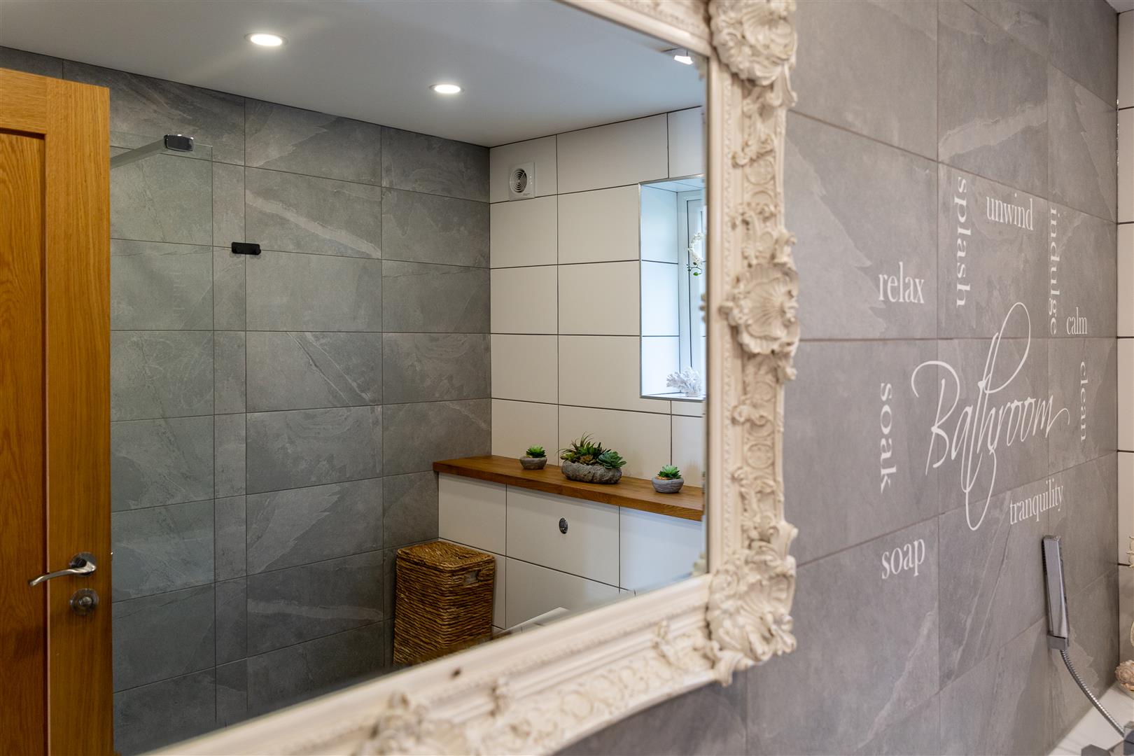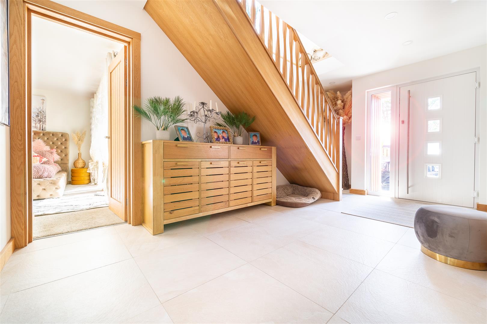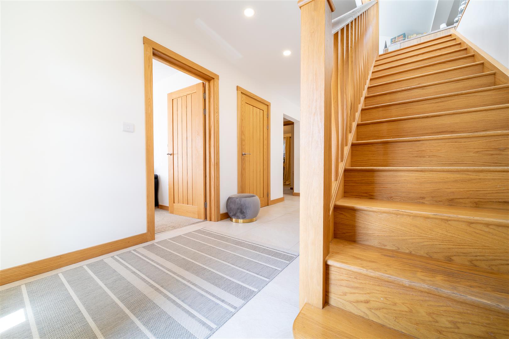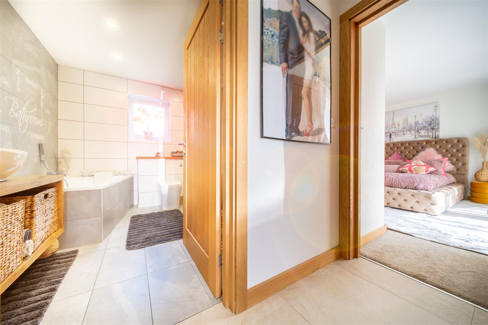Stepping through the front door into the hallway, the first impressions are exceptional. The oak staircase acts as a real focal point in this area. All four double bedrooms can be found on the ground floor, the main bedroom at the front, one at the rear and two at the side. Three of the bedrooms have built in wardrobes and they are all finished to a luxurious standard with sumptuous carpets. The main bedroom is served by a gorgeous, sleek en suite shower room and has doors opening into the south facing courtyard, a great spot for a morning coffee in the sun!