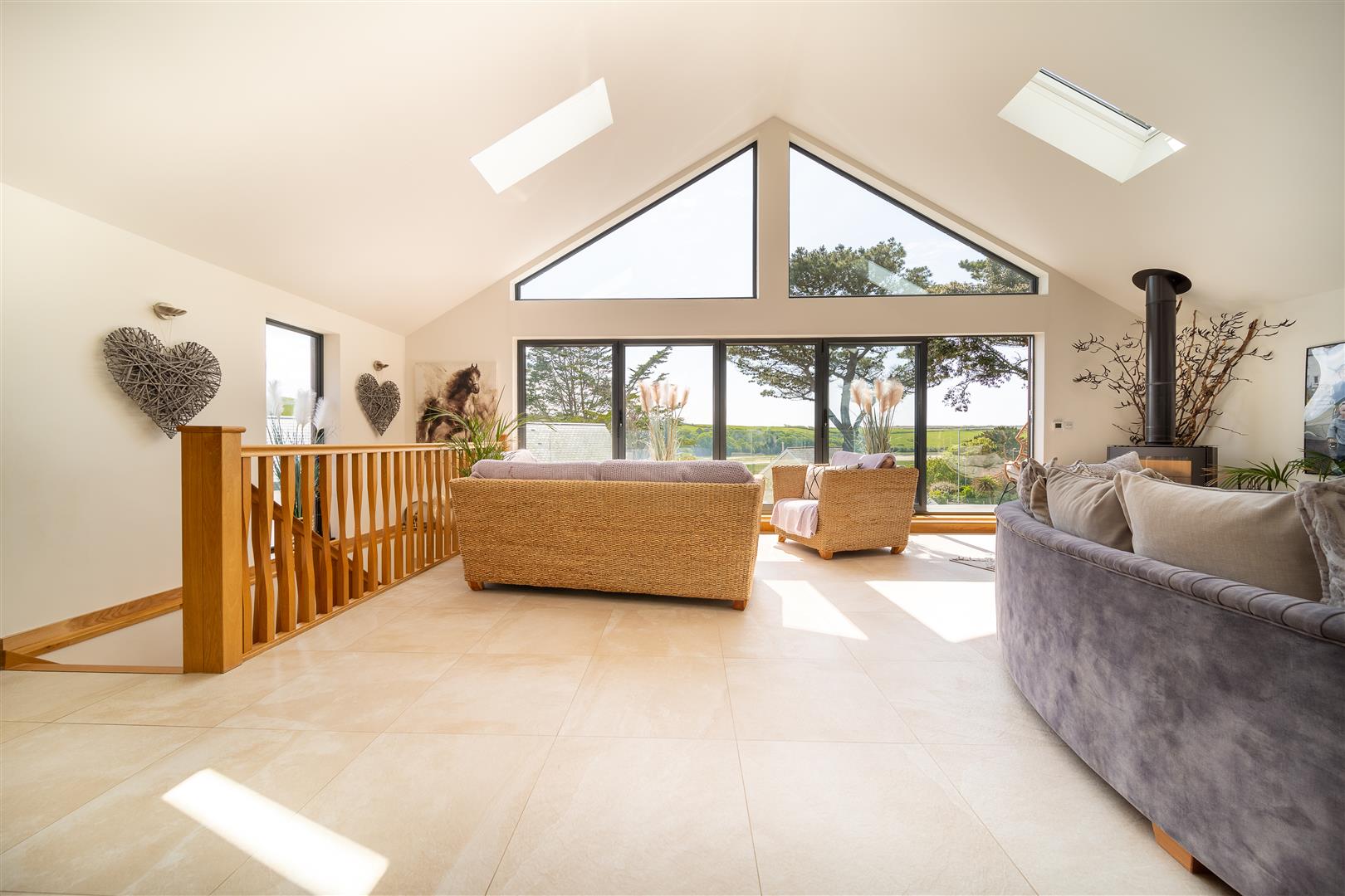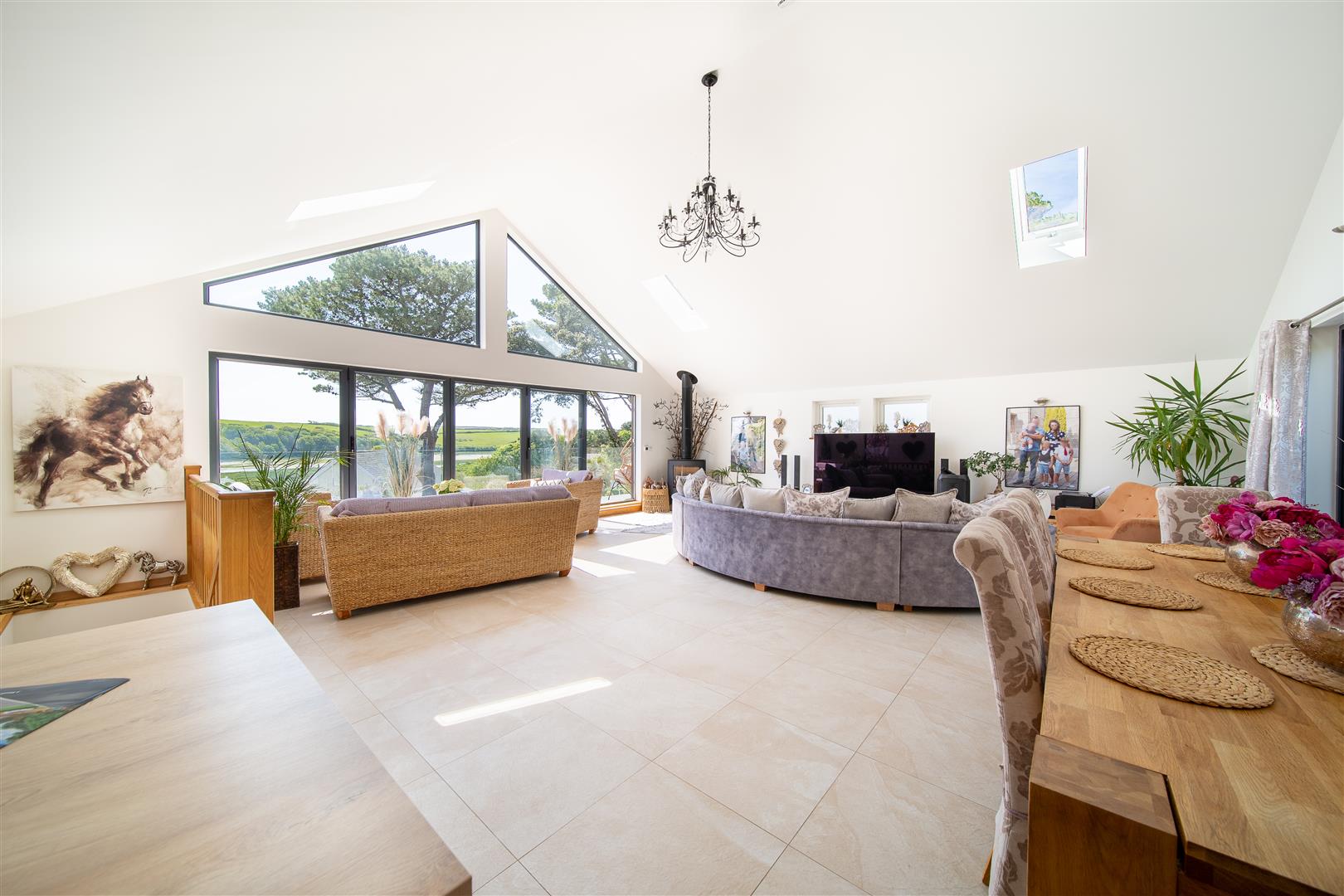 The impressive first floor, is open plan, has a vaulted ceiling and is exceptionally spacious with the added benefit of a log burner. You will immediately be drawn to the south facing balcony and impressive River Gannel views accessed by a full wall of bi-folding doors. If ever there was a room built for entertaining and spending time together as a family, surely this is it!