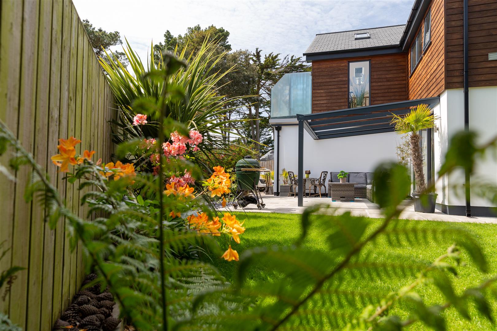 The garden at the rear is laid mainly to lawn, it is well stocked and private with a wide variety of established, well cared for shrubs and plants suited to the coastal environment. At the side, there's another area of lawn and off from the main bedroom is a large, sheltered south facing patio area.