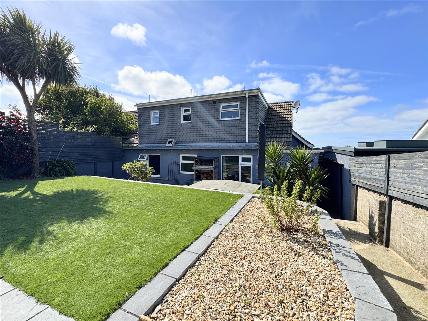 Externally, the home continues to impress. The front sun terrace extends the living space throughout the year, while ample parking is available at the front. At the rear, the garden maximises the spectacular views towards Whipsiderry, featuring a large seating area, astro turf, storage, and a garden shed — a perfect spot for entertaining or simply relaxing in the sun.