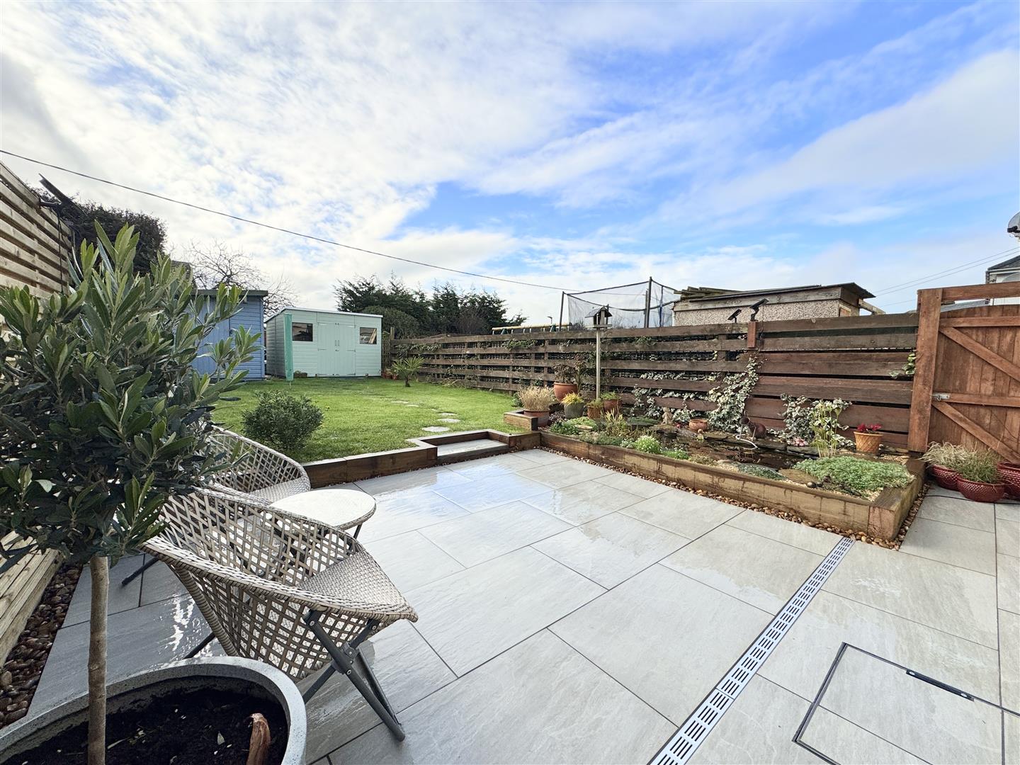 Externally, the rear garden is a standout feature. Beautifully landscaped and facing southerly, it enjoys sun throughout the day and includes a generous lawned area, a large patio ideal for outdoor entertaining or simply relazing in the sun, a charming garden pond, two sheds, and outdoor power.
