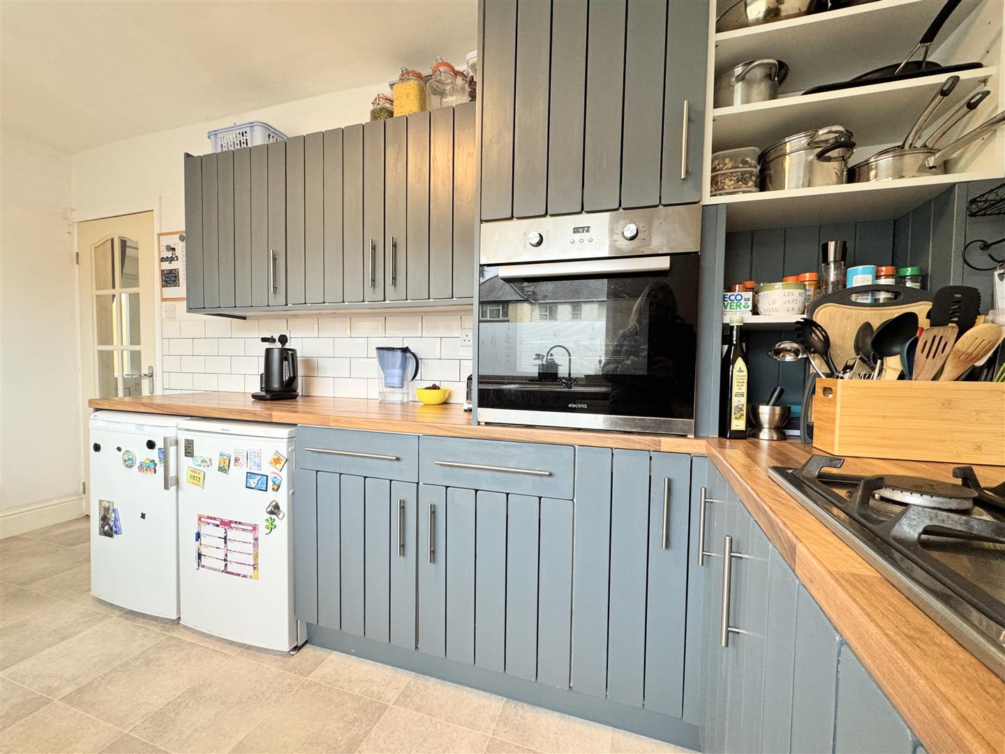 At the front of the property, the kitchen diner offers a good range of painted wooden units with space for an under-counter fridge, freezer, dishwasher and washing machine. There is an eye-level oven, gas hob and ample space for a family dining table. A large front-facing window gives the kitchen a welcoming, homely feel.