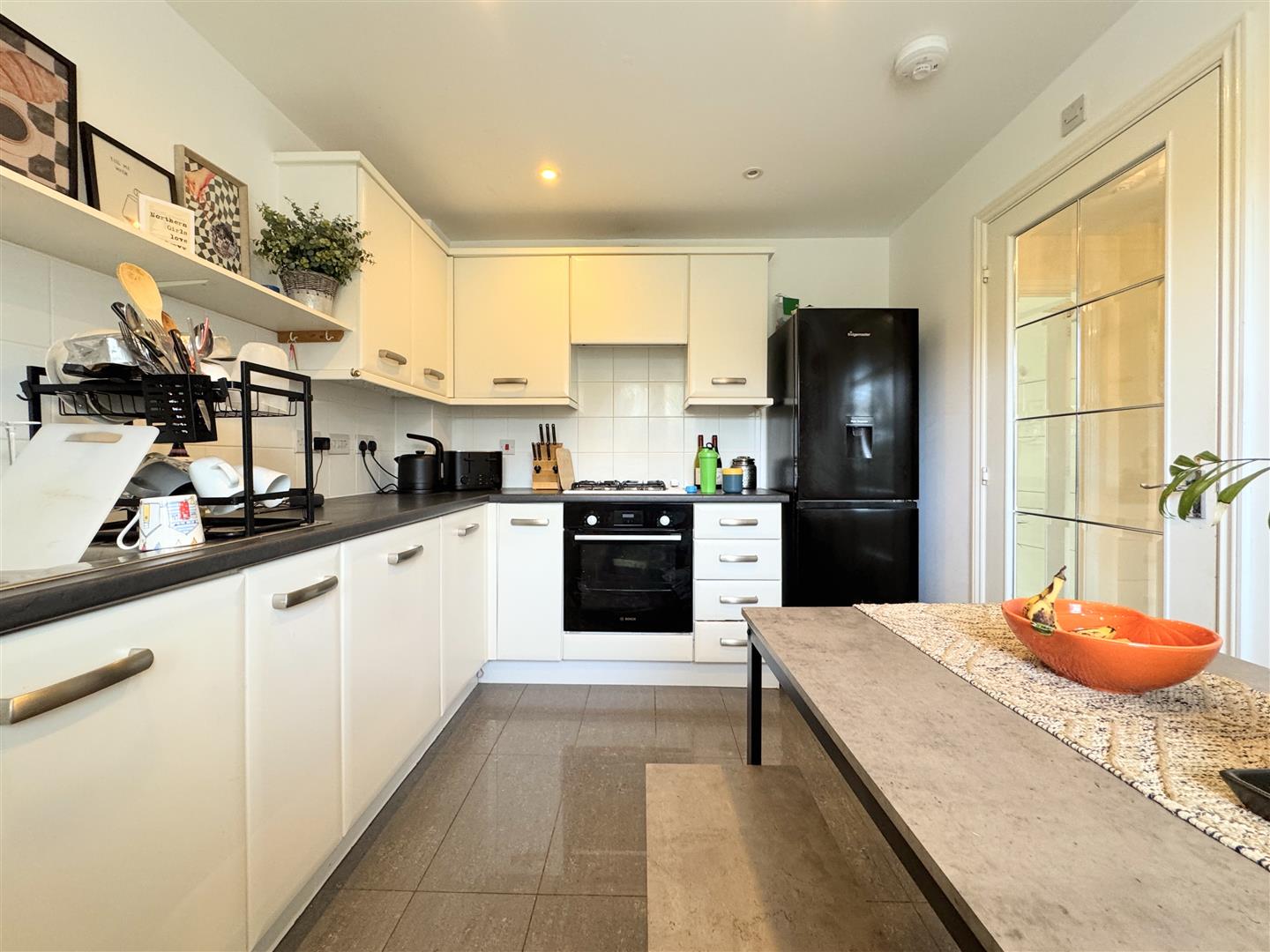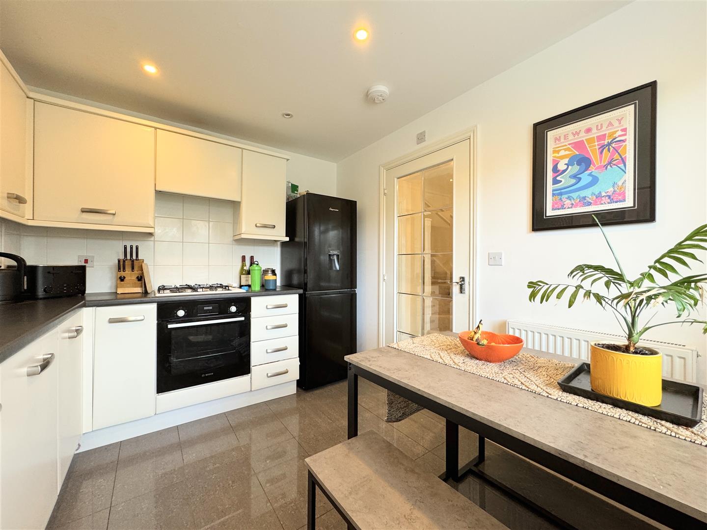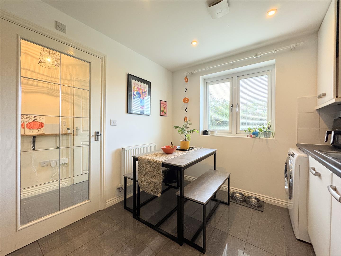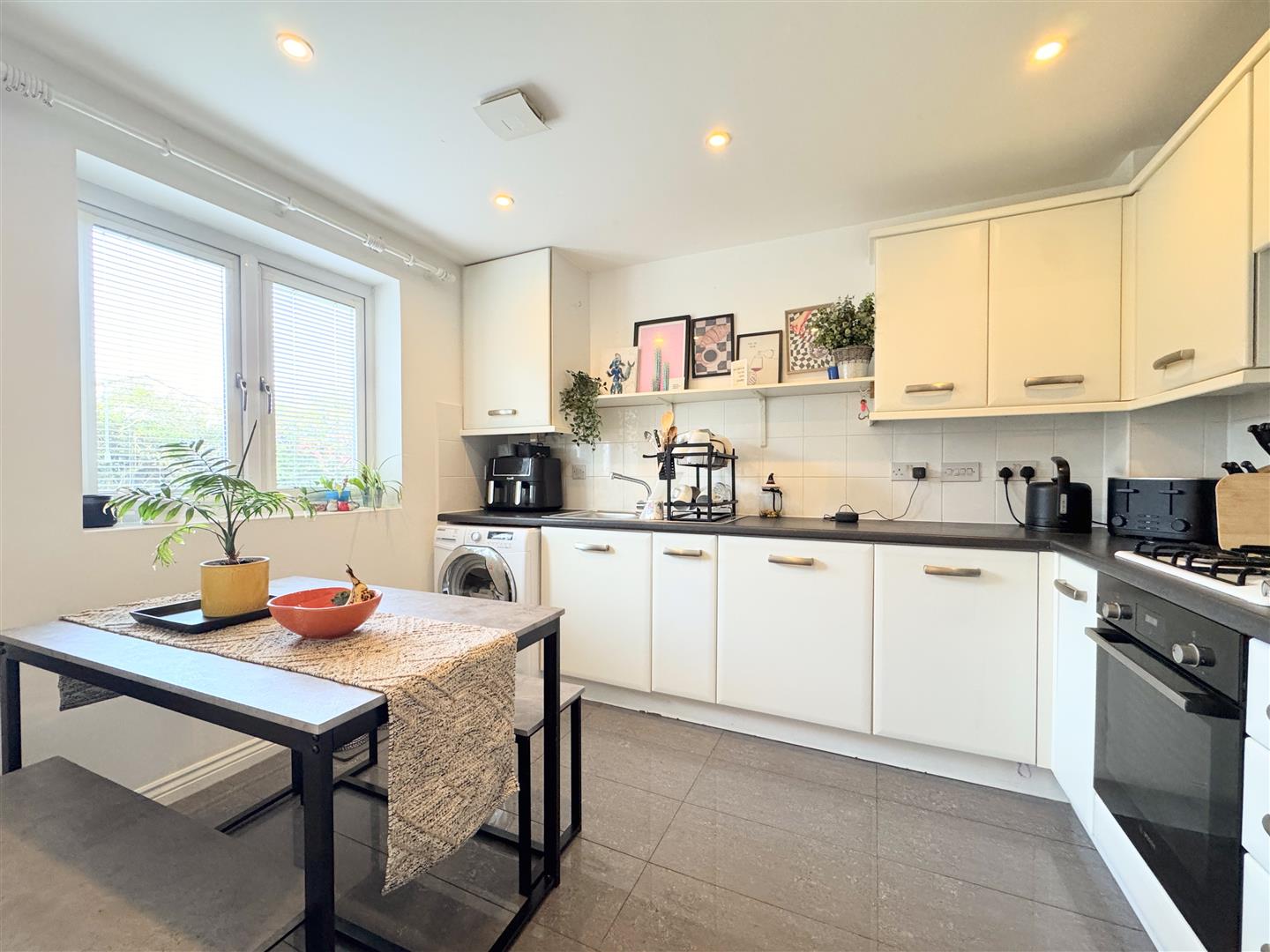 The entrance hallway features a convenient cloakroom and leads into a bright, front-facing kitchen that enjoys a westerly aspect. The kitchen is fitted with a generous range of matt white units, integrated oven and gas hob and space for a fridge freezer and washing machine. There is also ample room for a dining table, making it a sociable space for family meals.