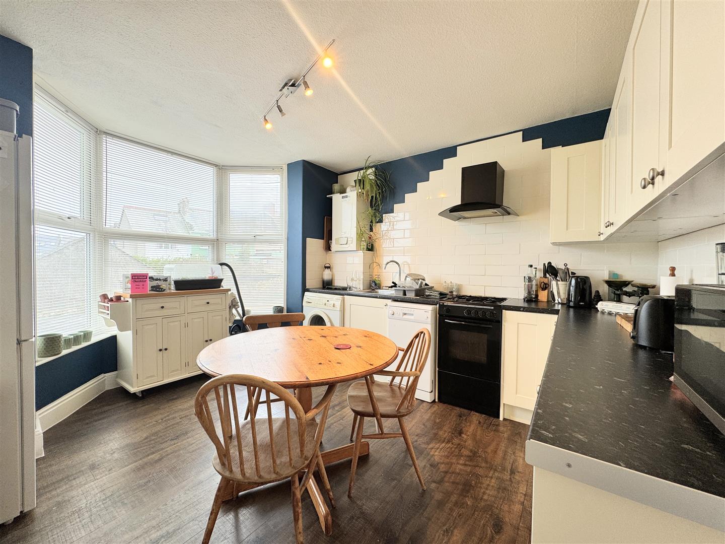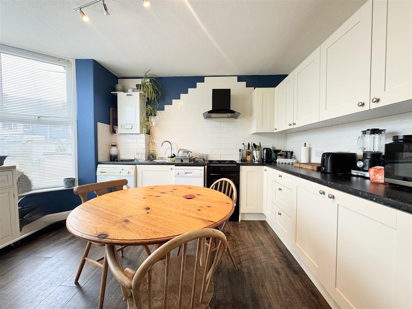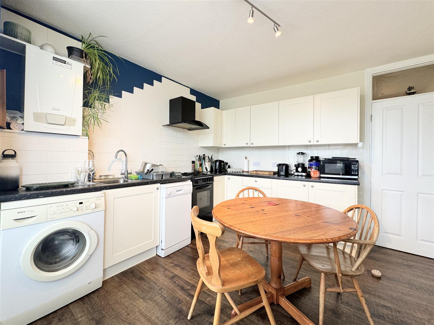 To the rear, the kitchen benefits from a window overlooking the back and offers sufficient space for a dining table. It is fitted with a good range of cream units and includes space for a fridge freezer, washing machine, and dishwasher.