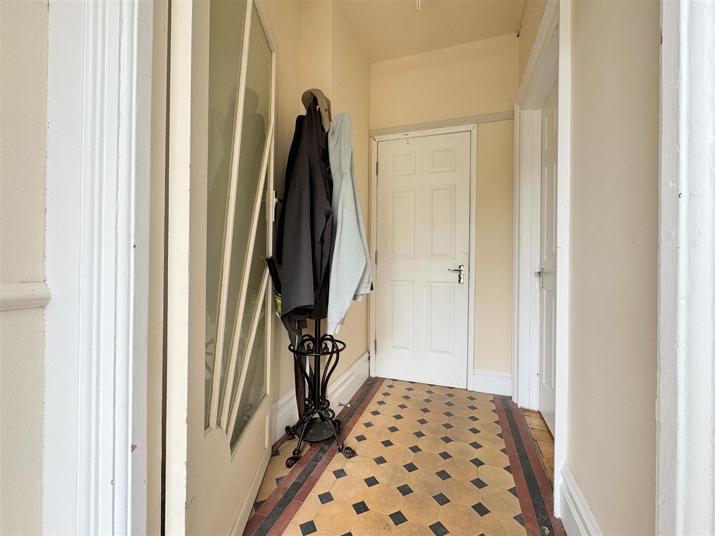 A bright and welcoming communal hallway, featuring a gorgeous original tiled flooring and shared with just one other flat, leads into a private entrance hallway with stairs rising to the first-floor flat.
