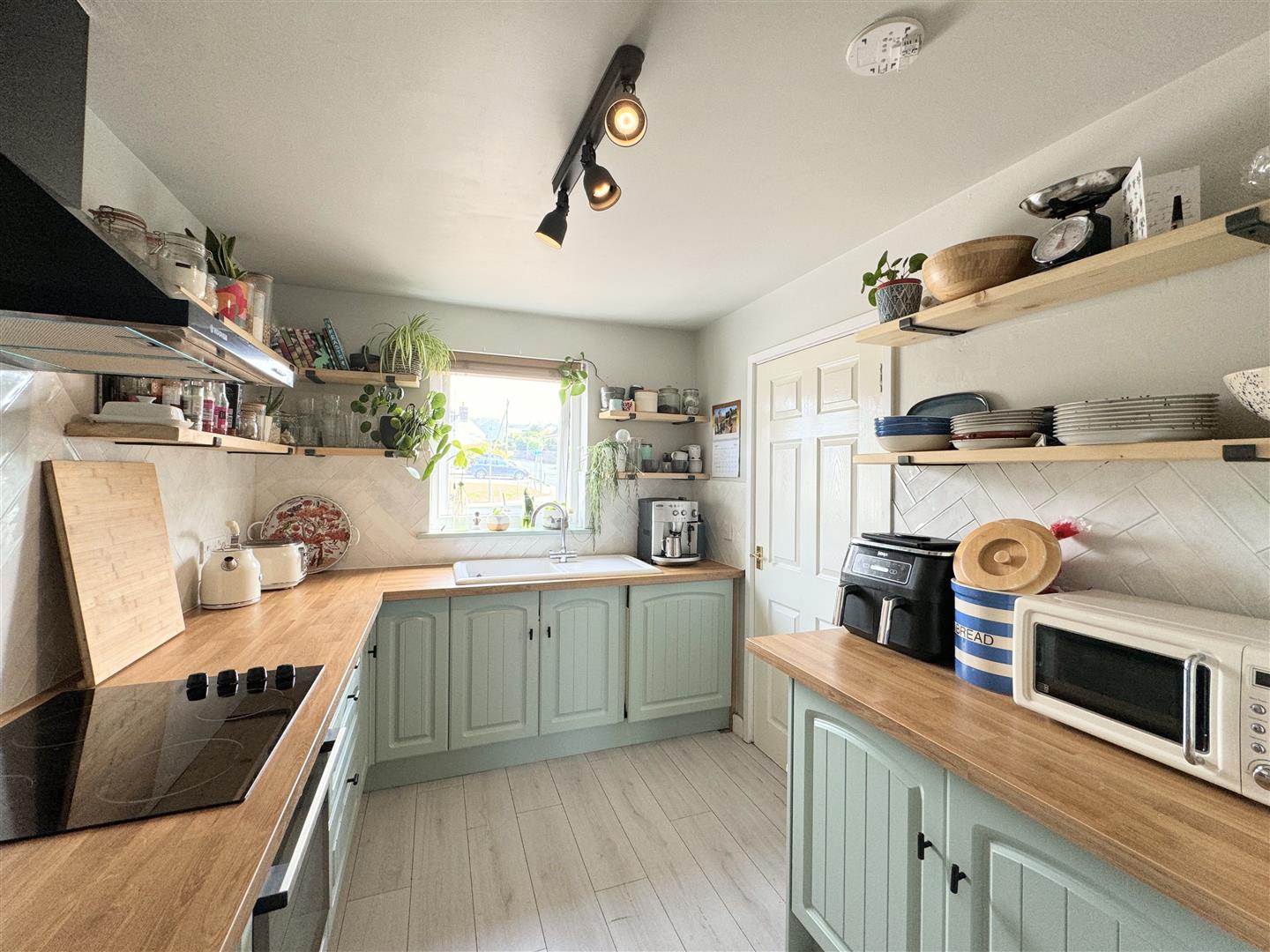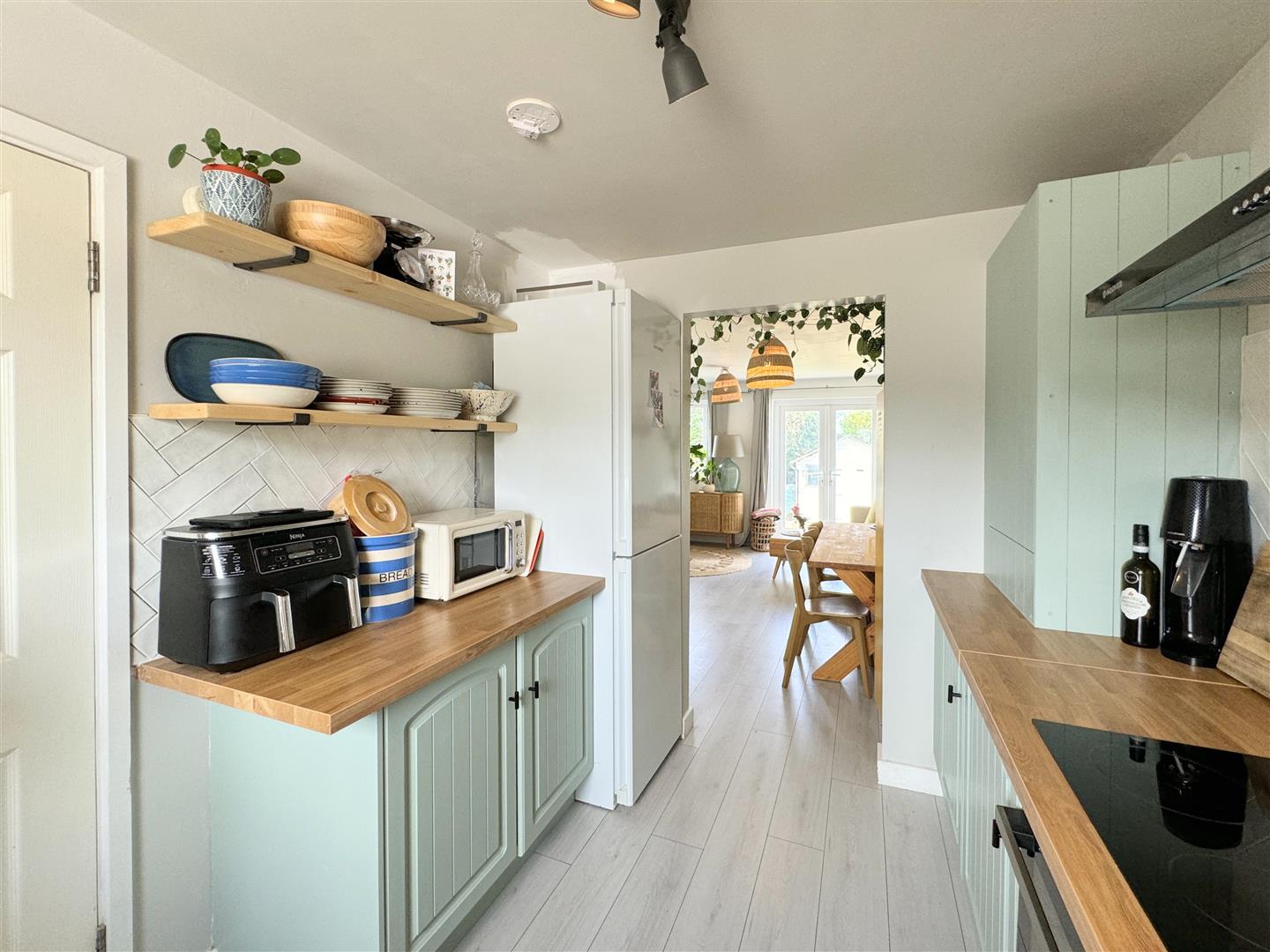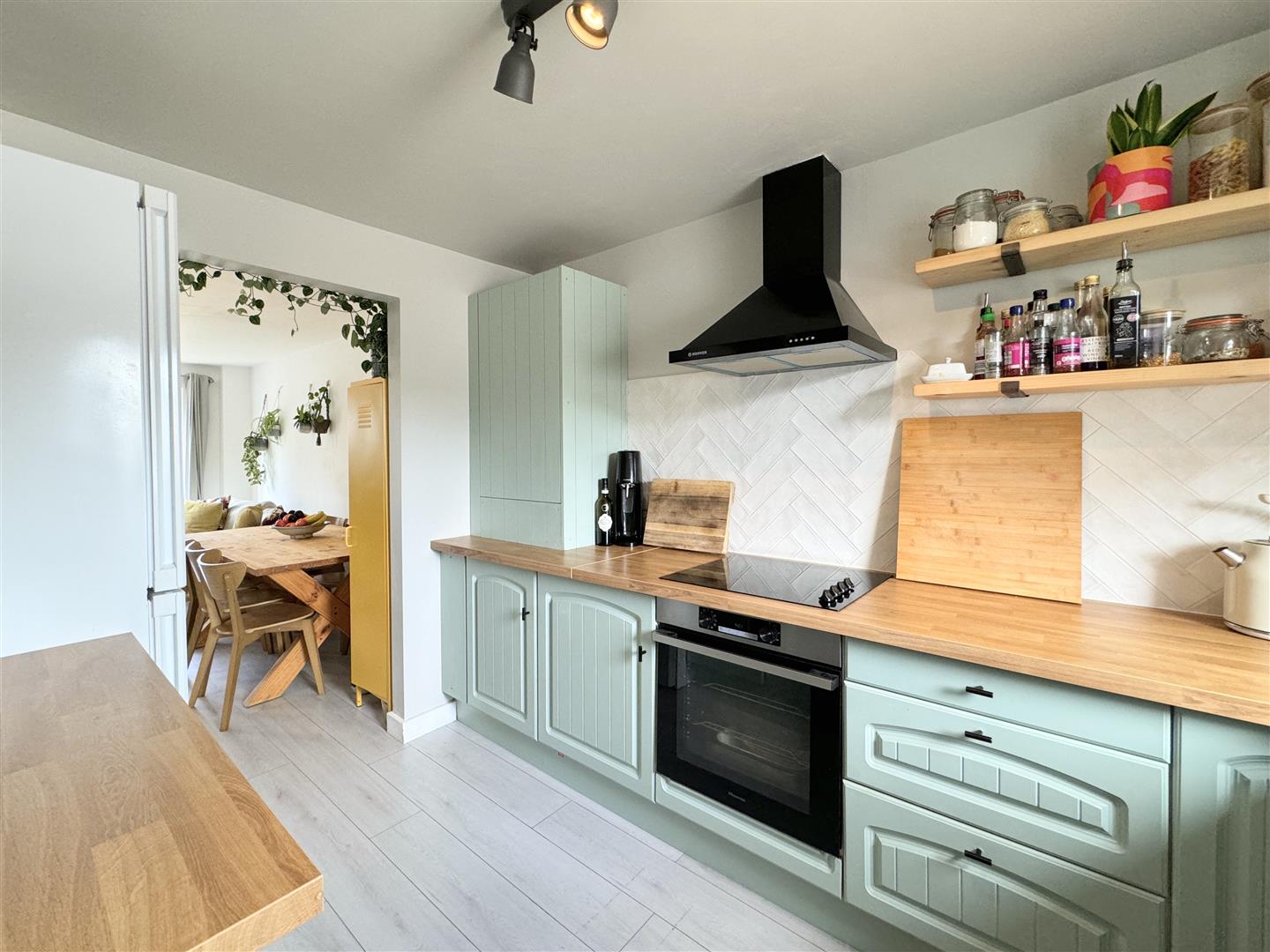 A welcoming hallway with stairs to the first floor guides you into this family home where you will find a recently refurbished cloakroom on the left which has plumbing for a washing machine and contemporary tiling. On the right, the kitchen which has a window to the front offers a good range of freshly painted shaker style units with an integrated dish washer, an electric oven and hob and some on trend shelving providing plenty of useful additional storage.