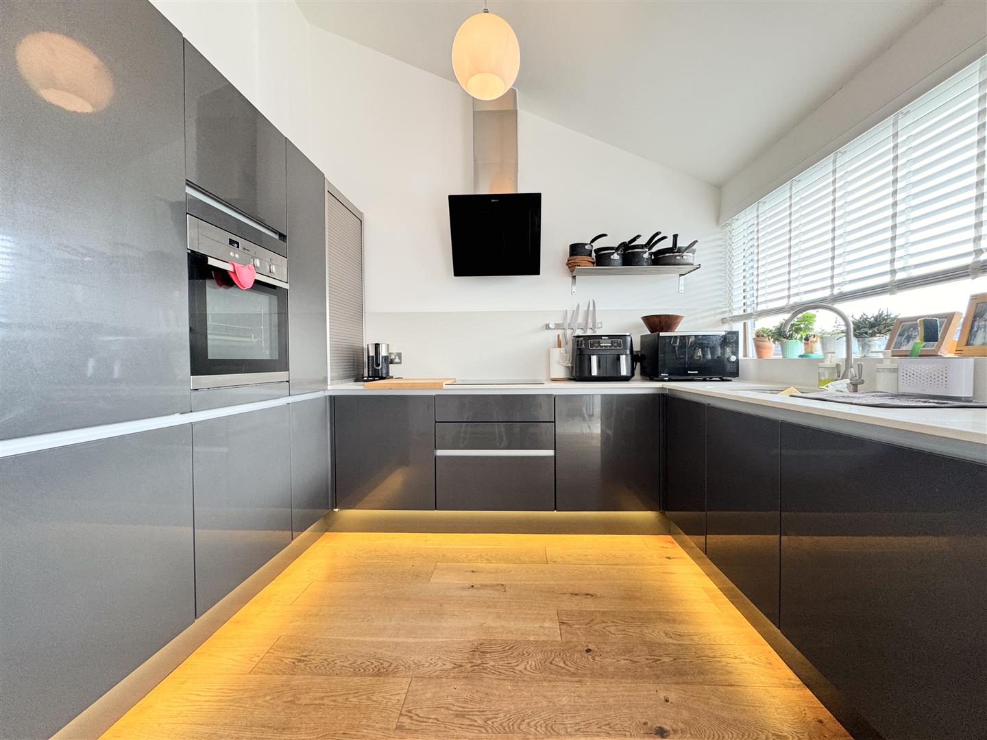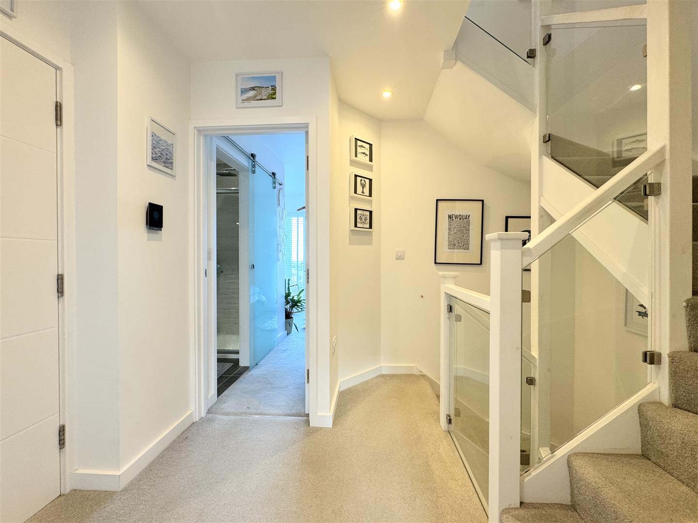 The second floor is dedicated to modern open-plan living. Over 30 feet of space is divided into lounge, dining, and kitchen areas. The rear lounge opens through full-height sliding doors to a sheltered balcony, offering jaw-dropping vistas across Newquay Bay, the town, and north along the Cornish coast to Trevose Lighthouse. The front-facing kitchen and dining space is sleek and contemporary, fitted with contemporary gloss units and integrated appliances, including an 'Appliance Garage' with a tambour door enabling the toaster and kettle to be hidden away. This whole area provides the perfect environment for cooking, relaxing and entertaining.