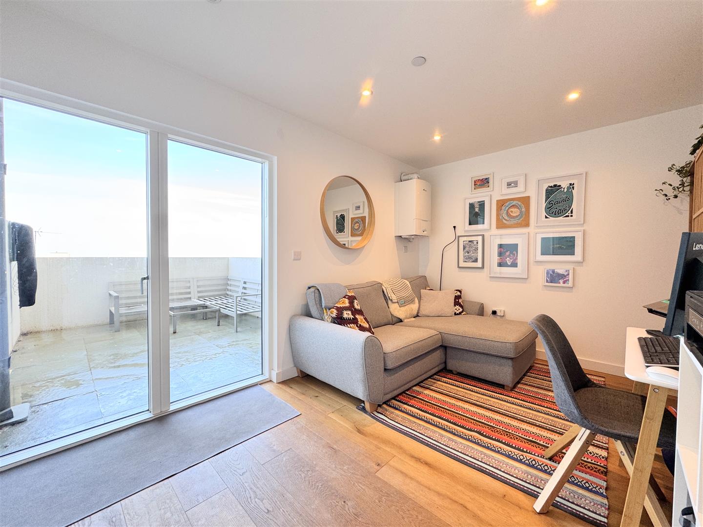 Quay Court is an exclusive enclave of just eleven distinctive homes, each designed to blend modern elegance with functional coastal living. Step inside the ground floor to find two generous double bedrooms and a fully tiled, contemporary shower suite—perfect for guests or family members. Stairs lead up to the first floor, where flexibility reigns: one bedroom currently doubles as a second living room or study, opening via patio doors to a rear terrace with glorious sea views. A basement level houses a utility room and surf store, fully plumbed and ideal for dry storage, complete with an outdoor hot and cold surf shower.