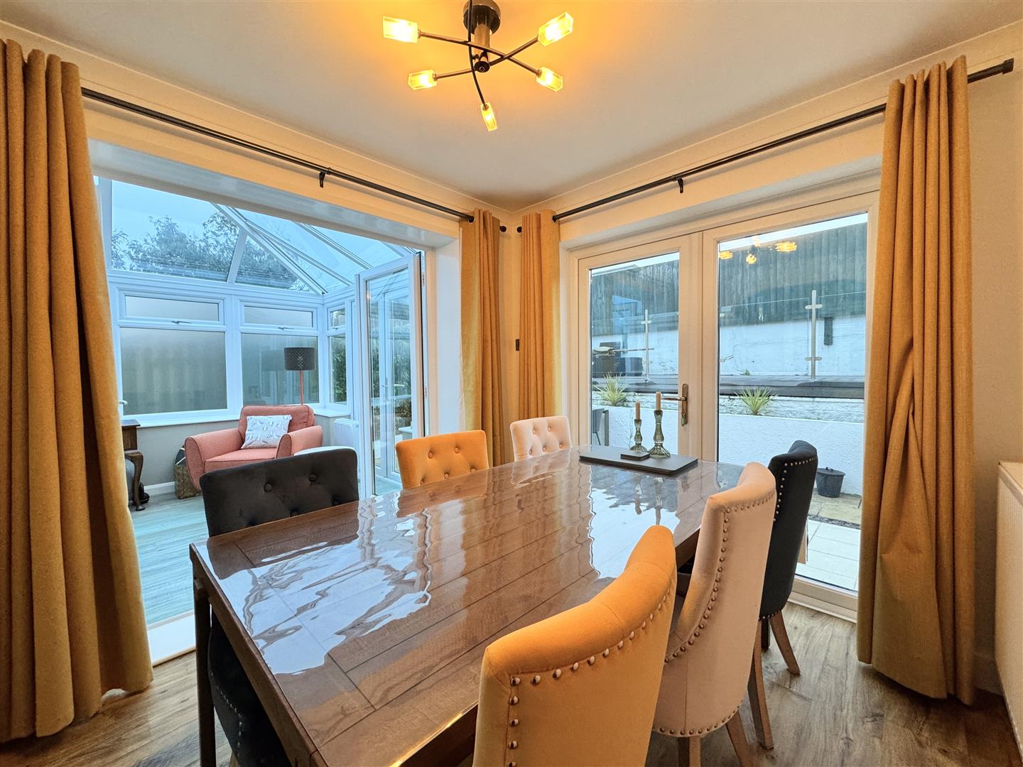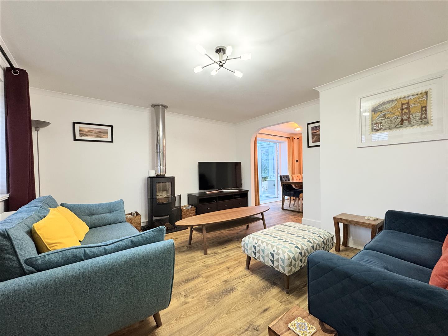 A welcoming porch provides space for coats and shoes and leads into a bright, spacious hallway with a storage cupboard and access to all rooms. On the left, a dual aspect lounge features a log burner, perfect for cosy winter evenings, and flows seamlessly into a dining area large enough for a family-sized table, which opens into a conservatory. Doors from the conservatory lead to both the front and rear gardens, ideal for summer entertaining and family gatherings. This versatile room benefits from under-floor heating and offers the perfect space for a home study, playroom or additional lounge.