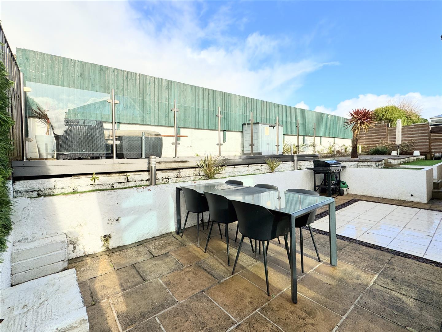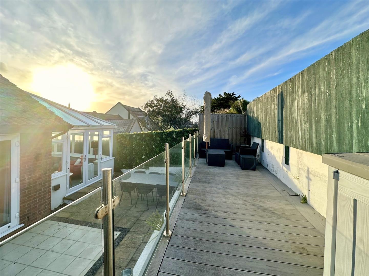 The outdoor areas are a real highlight of this property, boasting bright, sunny gardens at both the front and rear. The front provides parking for up to four cars and gated access to a private, sun-filled garden. A paved path leads to the conservatory, with most of the garden laid to lawn, complemented by a decked terrace—an ideal spot to relax with an evening glass of wine. At the rear, a patio area offers the perfect setting for al fresco dining, with a path leading past the garage and log store up to the main tier of the garden. Elevated to catch the sun throughout the day, the rear garden is low-maintenance, featuring a mix of patio and decked areas framed by sleek glass balustrades, creating a contemporary and open feel. There's also an outdoor shower. The garage benefits from both front access via an electric up-and-over door and rear access from the garden. Inside, it is a versatile space with power, lighting, and additional plumbing, making it ideal for use as a utility area or storage.