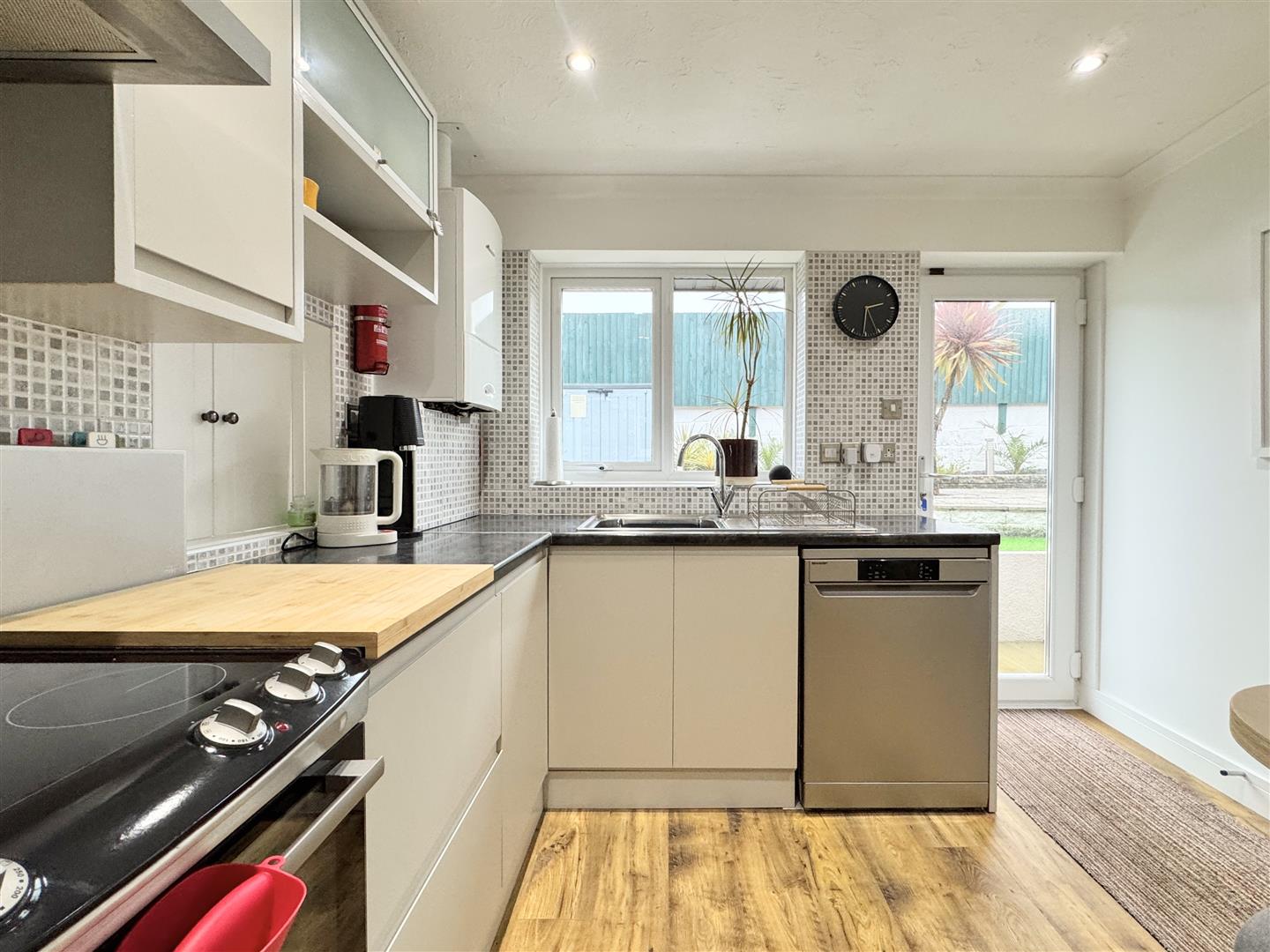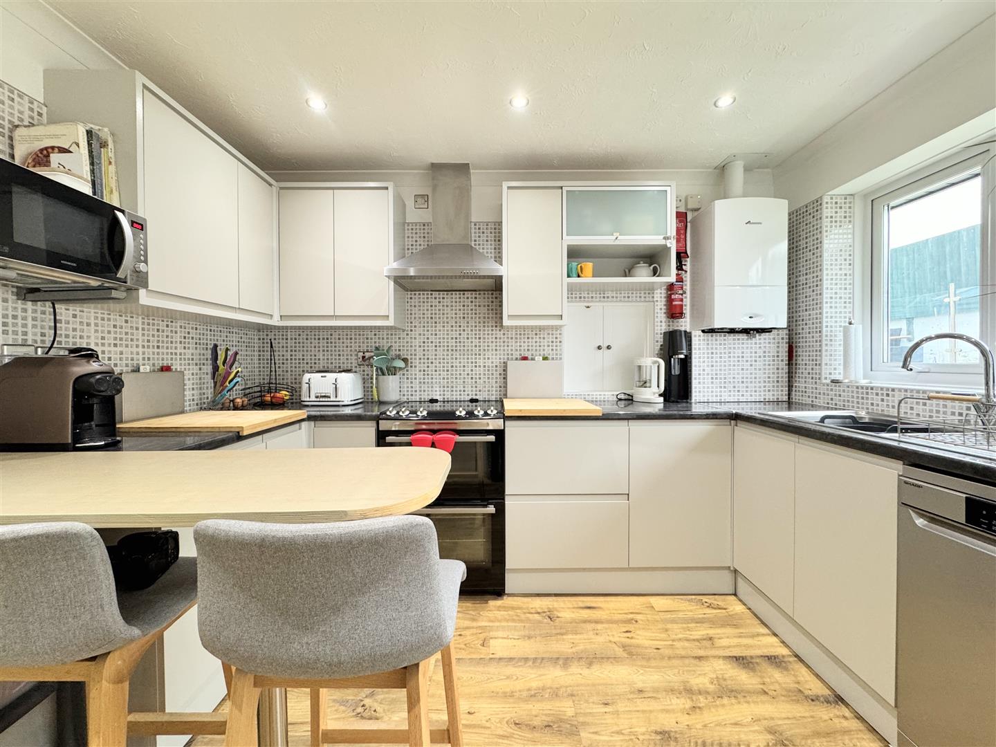 At the rear, the kitchen boasts a generous range of sleek modern matt units with space for an oven and dishwasher, a breakfast bar, and a door opening directly onto the rear garden for easy indoor-outdoor living.