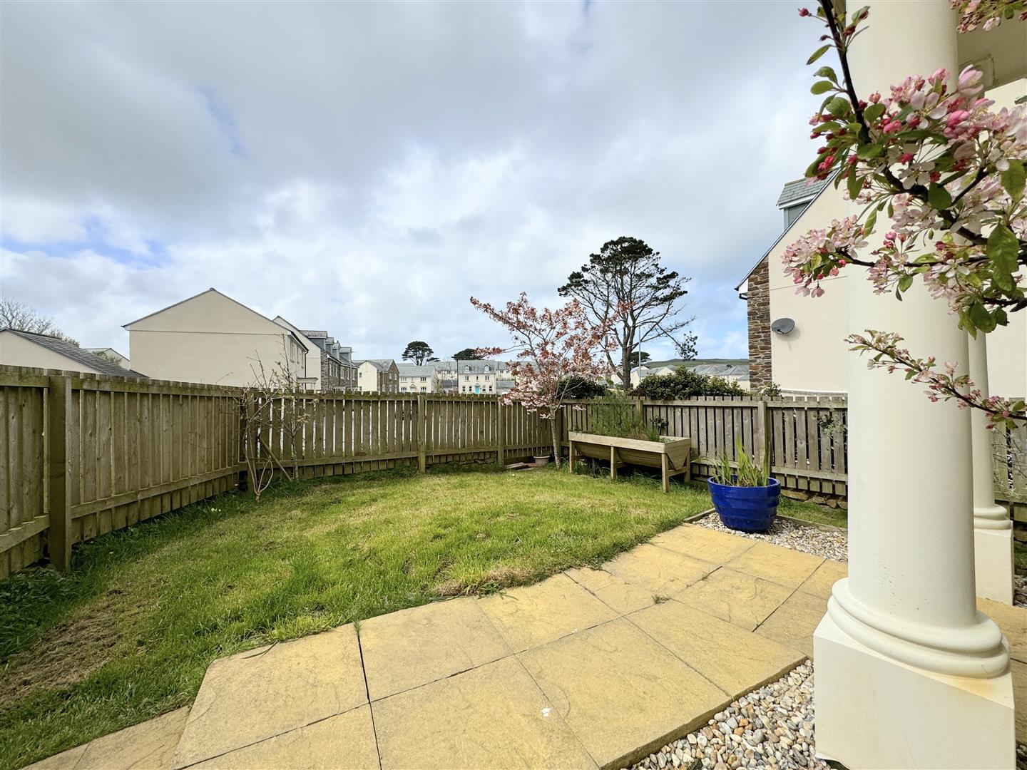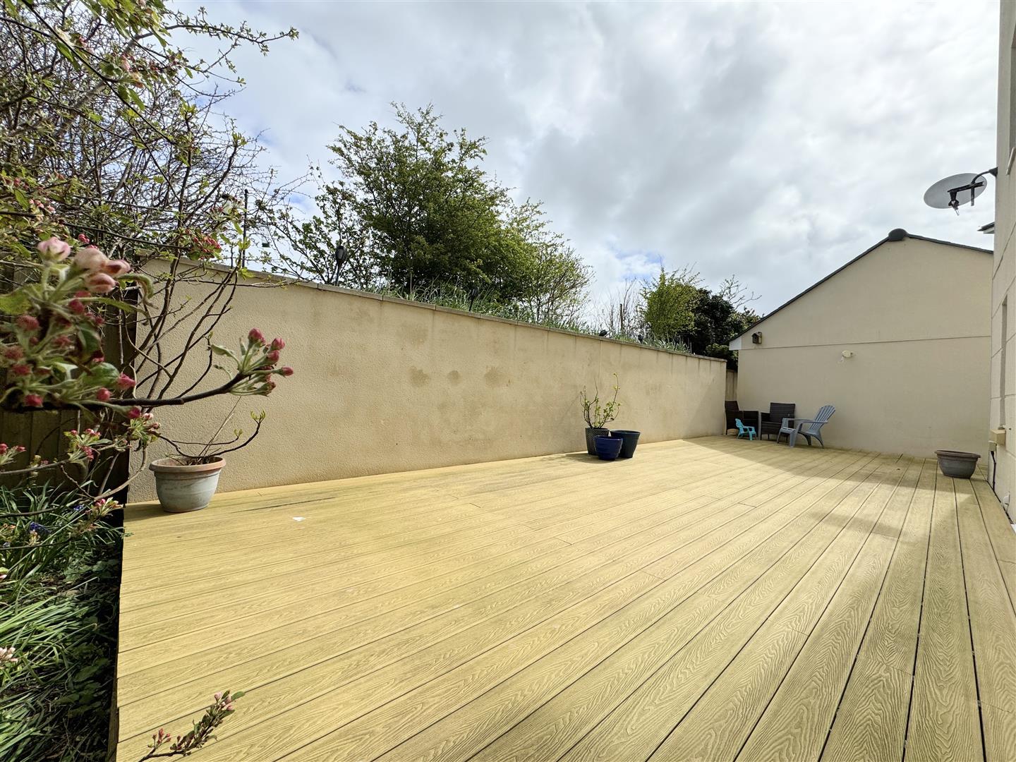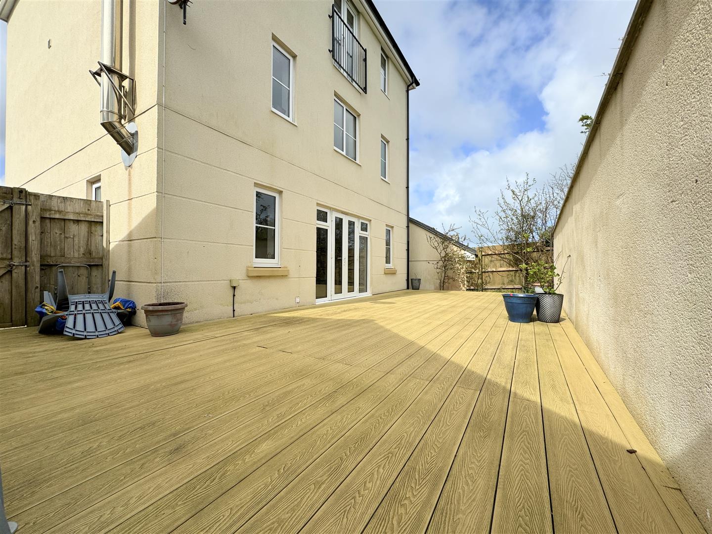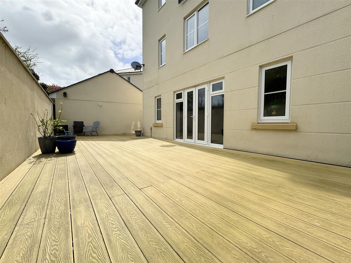 At the rear, the garden is private and fully enclosed, a particularly sheltered spot to enjoy the sun laid with composite decking.