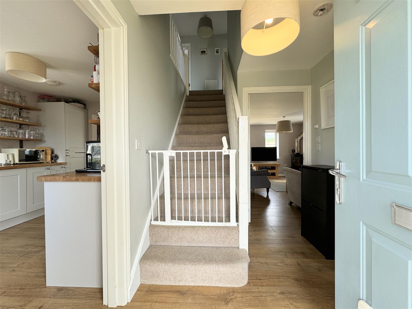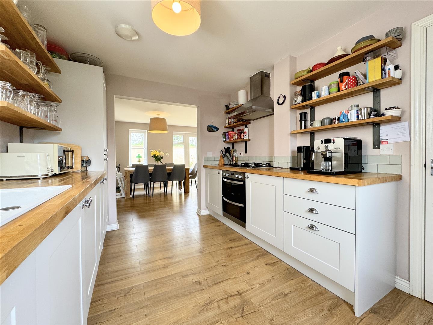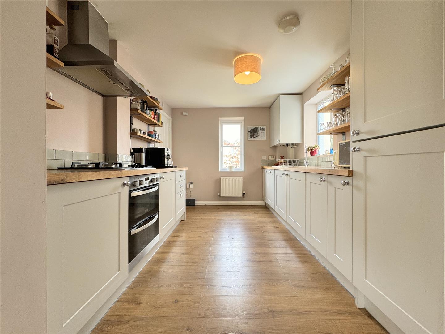 An entrance hallway with stairs to the first floor guides you into this gorgeous property. On the right, you will find a utility/WC with plenty of storage for coats and shoes. On the other side, the kitchen opens into an L-shaped lounge diner which has triple aspect windows allowing for plenty of natural light at all times of the day. The kitchen offers a good range of shaker style units with an electric double oven and gas hob, an integrated dish washer, washing machine and fridge freezer all complimented by solid wood work tops.