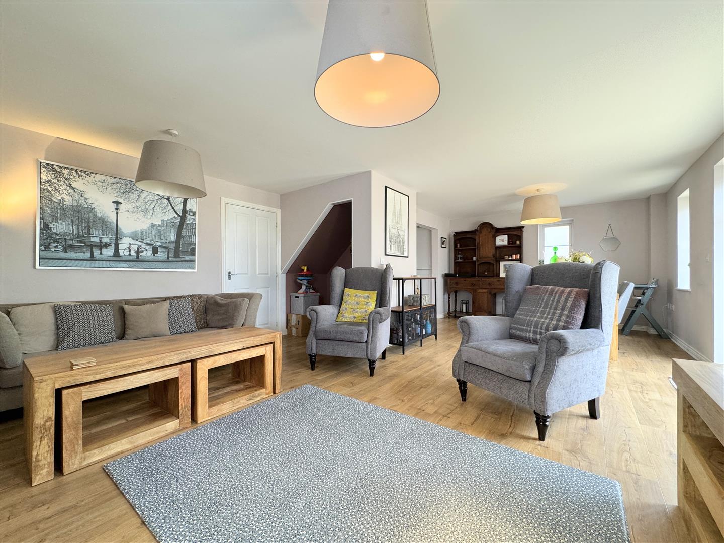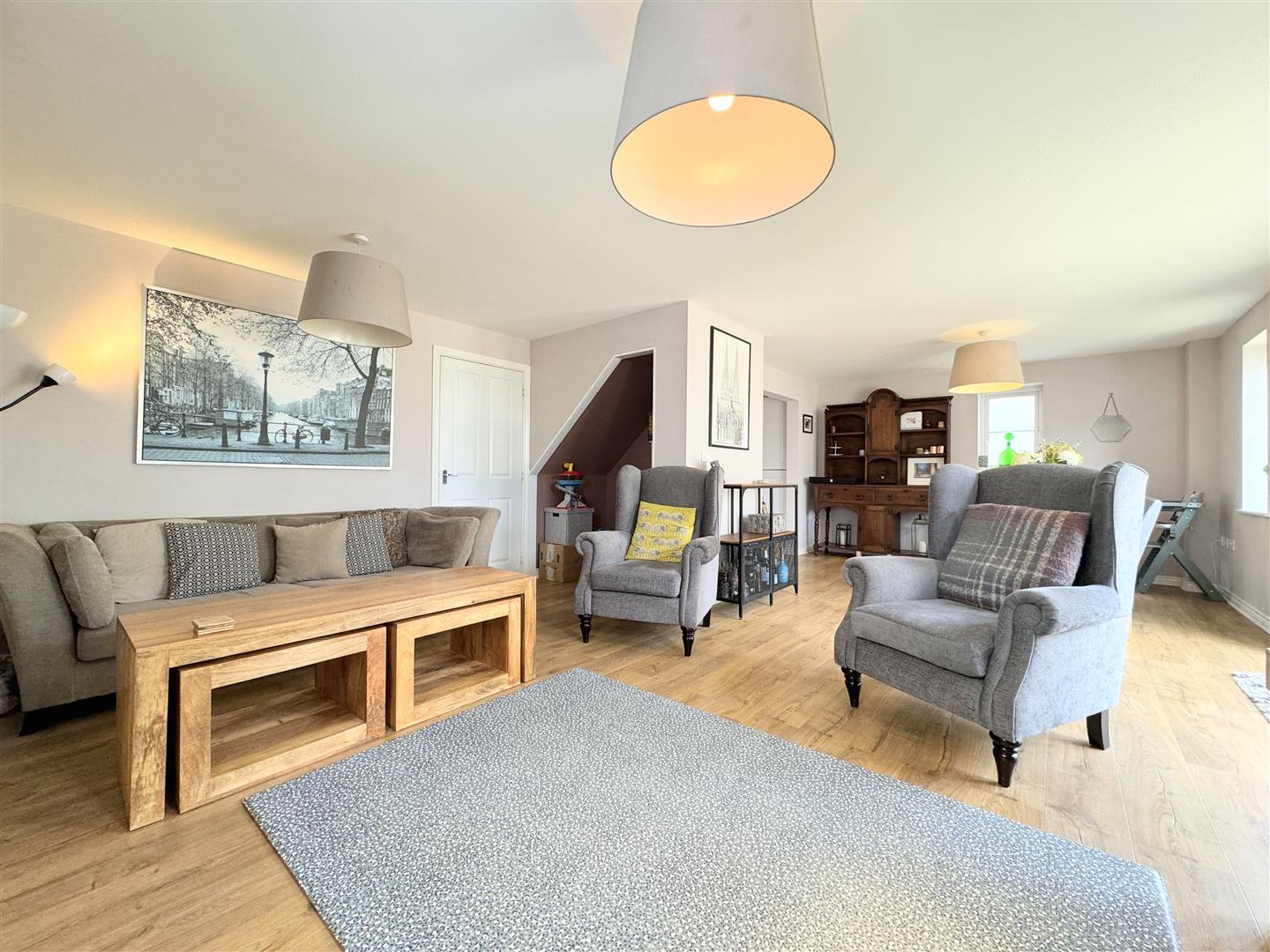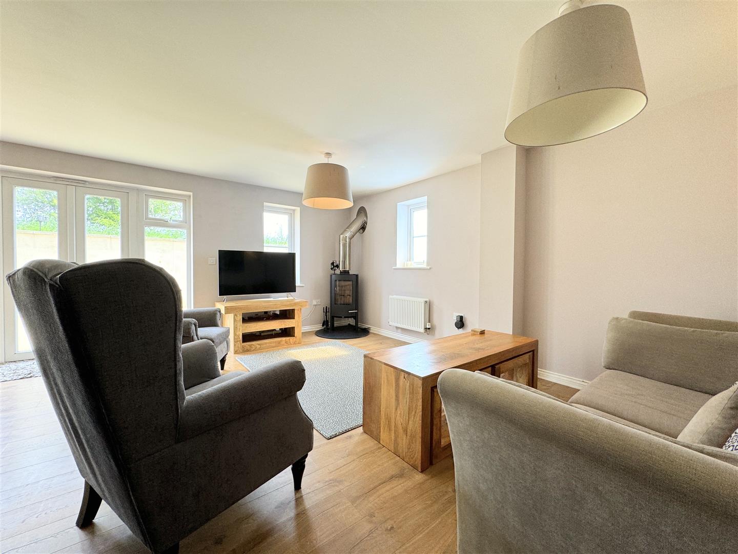 An entrance hallway with stairs to the first floor guides you into this gorgeous property. On the right, you will find a utility/WC with plenty of storage for coats and shoes. On the other side, the kitchen opens into an L-shaped lounge diner which has triple aspect windows allowing for plenty of natural light at all times of the day. The kitchen offers a good range of shaker style units with an electric double oven and gas hob, an integrated dish washer, washing machine and fridge freezer all complimented by solid wood work tops.