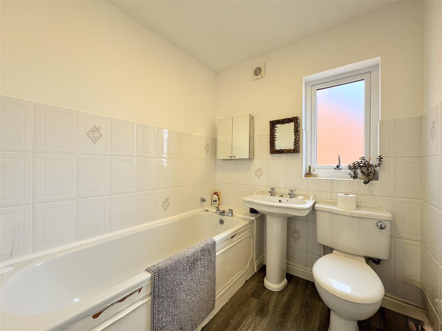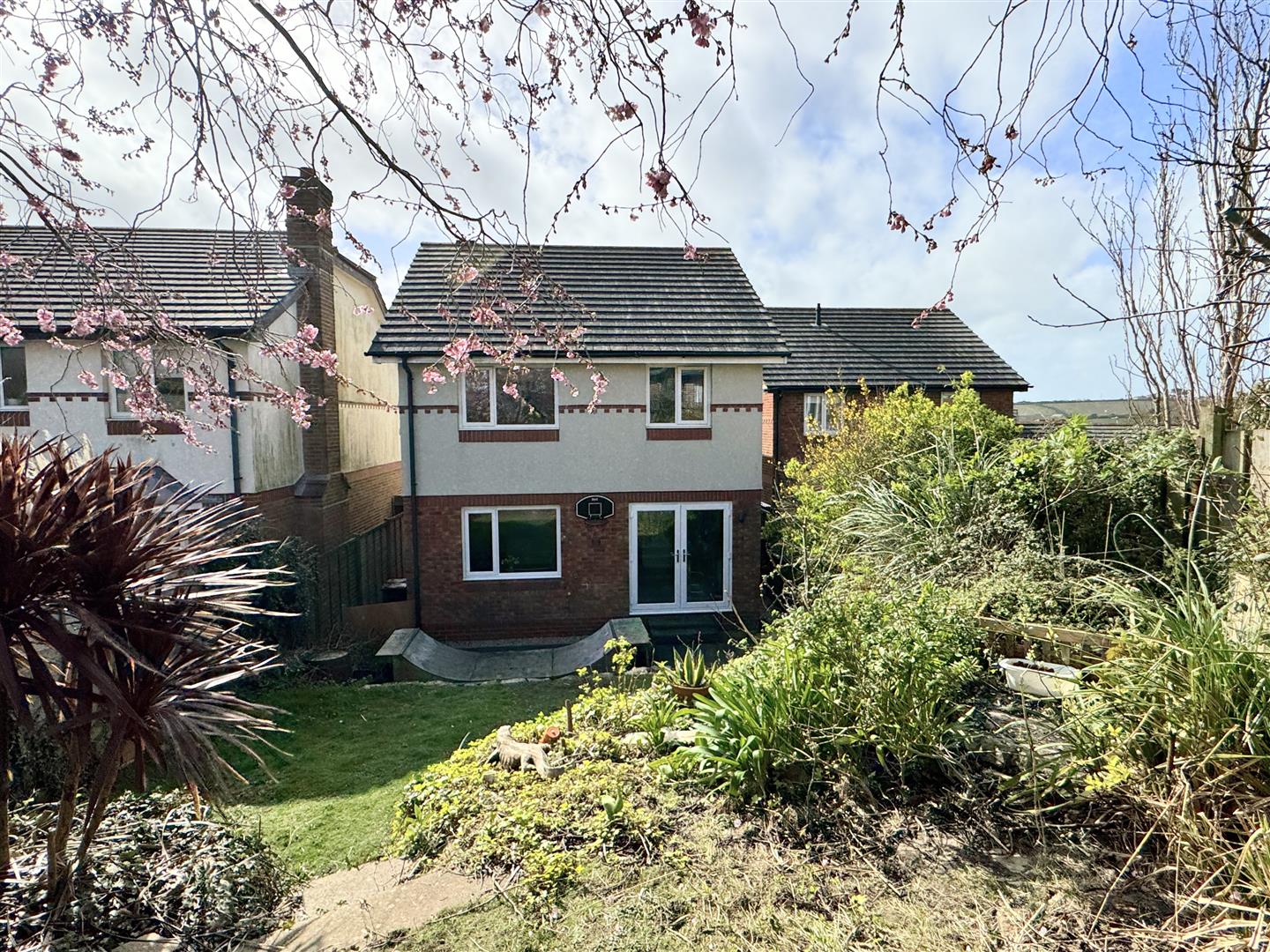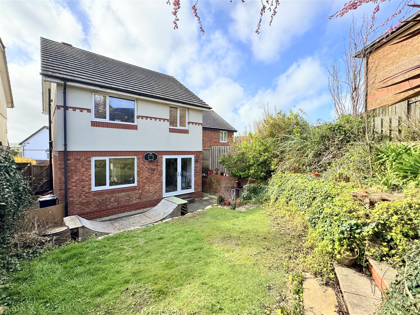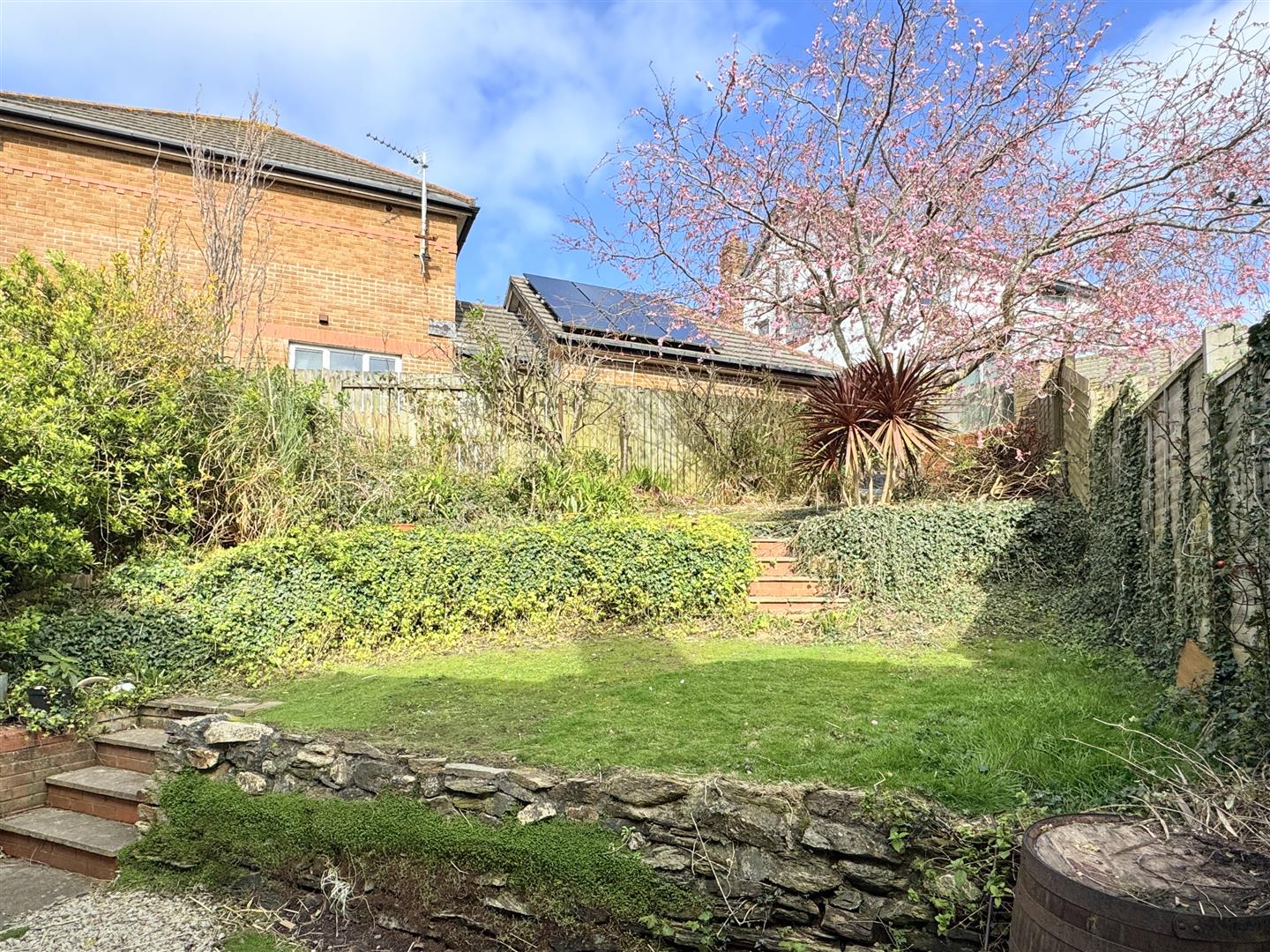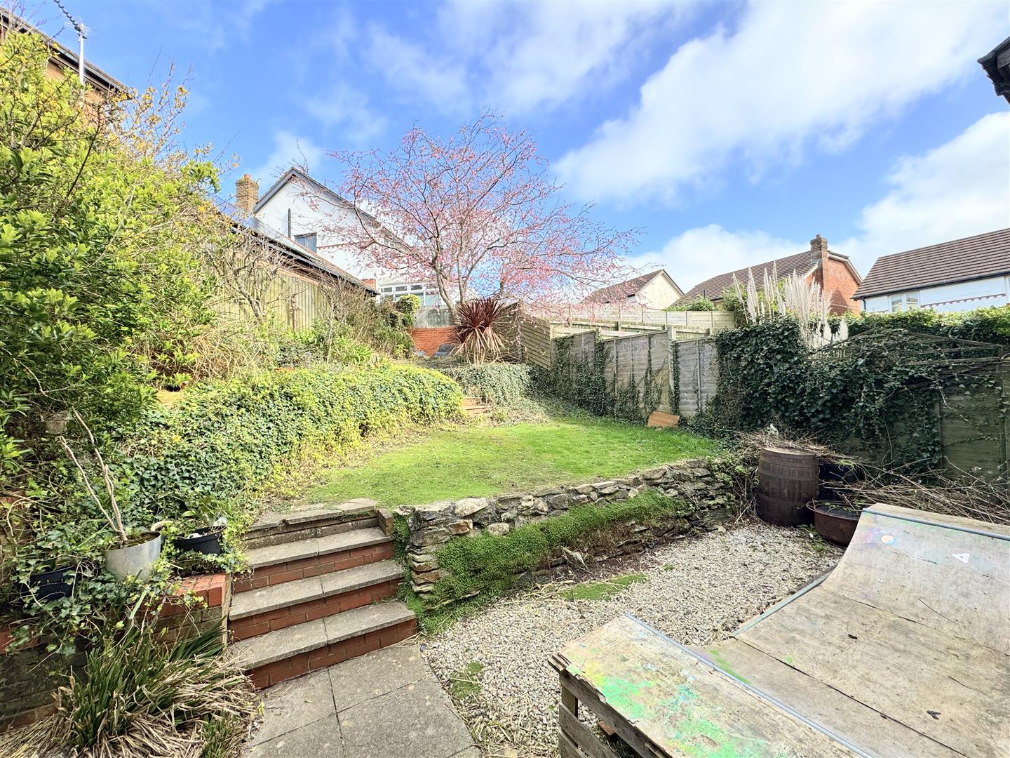Outside, the rear garden has been thoughtfully terraced to make the most of the afternoon and evening sunshine. It offers a generous patio area, complemented by mature shrubs, plants, and trees, including a stunning cherry blossom that adds seasonal beauty to the space.