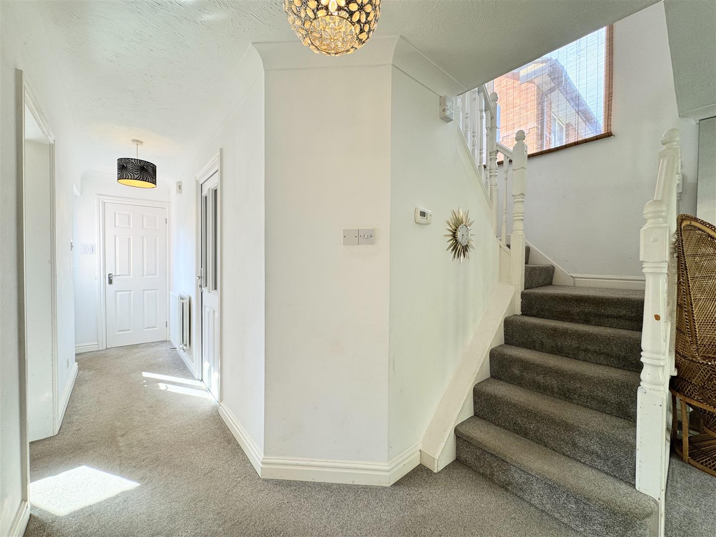 Upstairs, there are four well-proportioned bedrooms, including three doubles and a single. The principal bedroom benefits from its own en-suite shower room, while the family bathroom is fitted with a bath and shower over. The spacious landing features a large storage cupboard, loft access, and a generous window that floods the area with natural light.