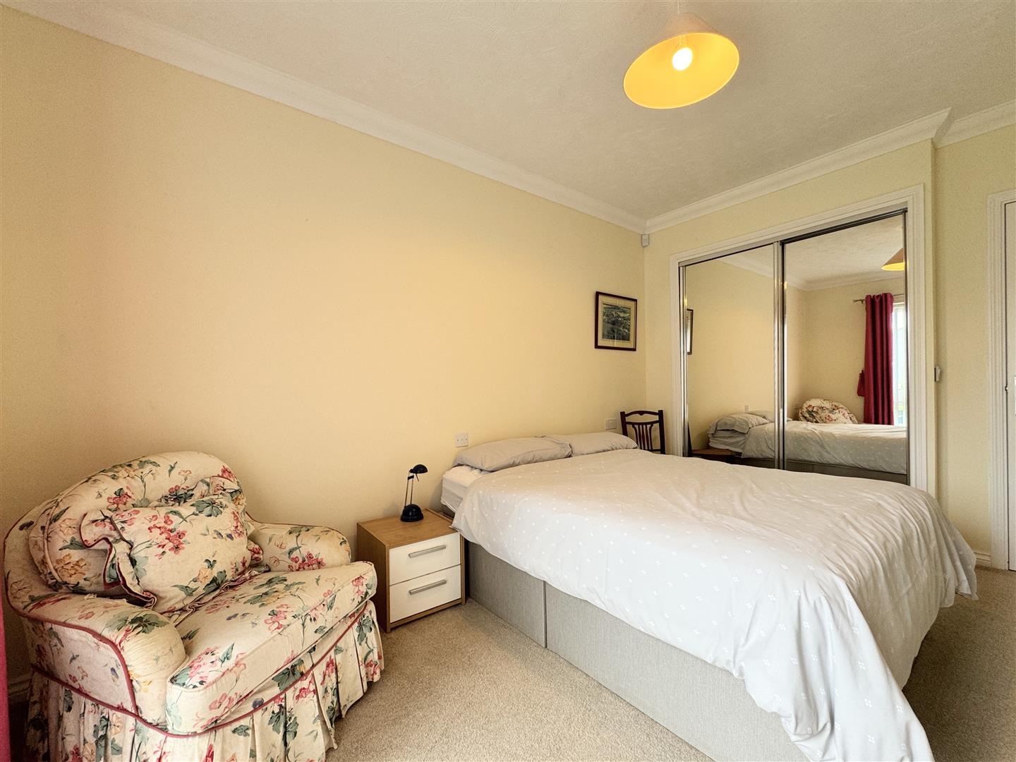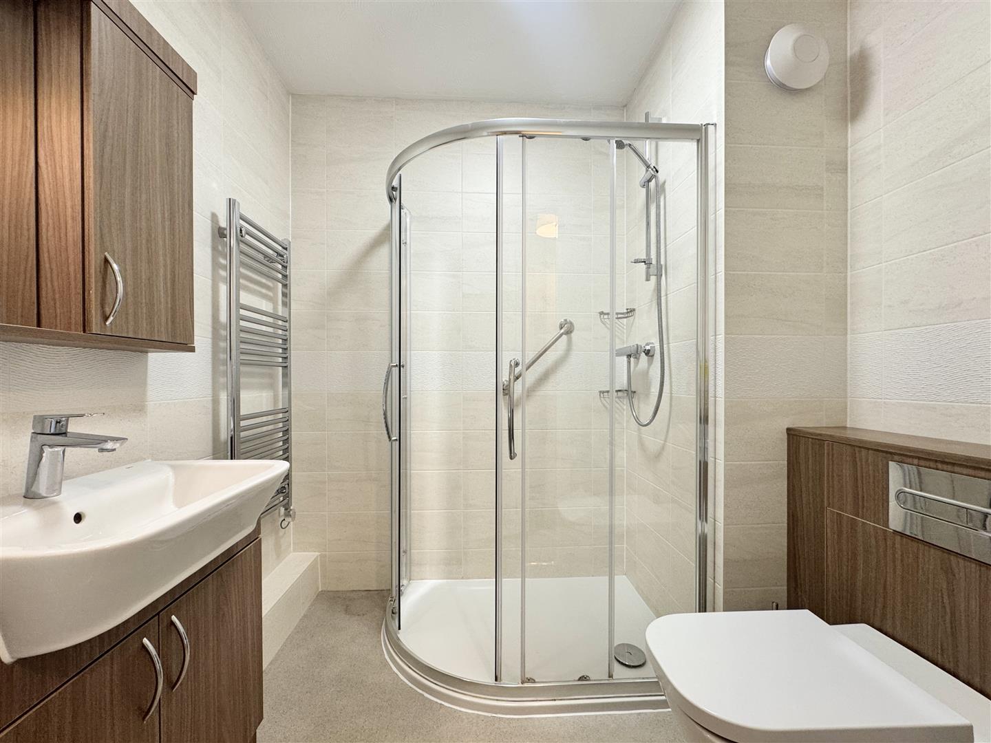 The generous double bedroom includes built-in mirrored wardrobes and benefits from the same access to the communal gardens. Completing the accommodation, the fully tiled shower room features a large walk-in shower, wc, wash basin and heated towel rail.