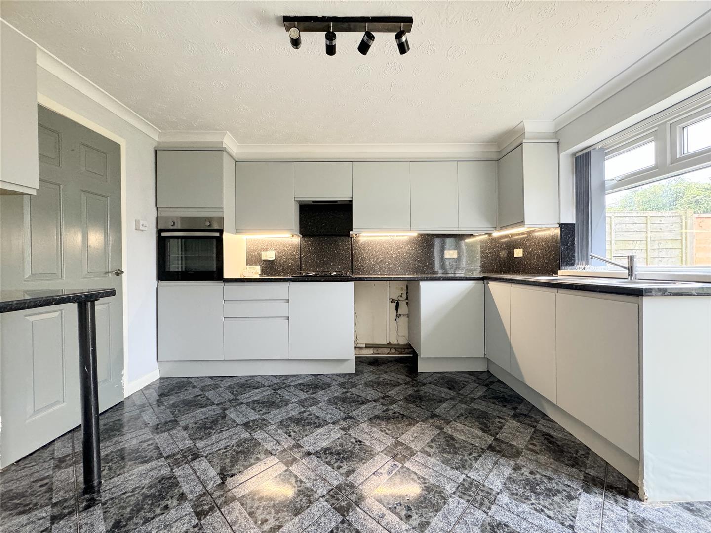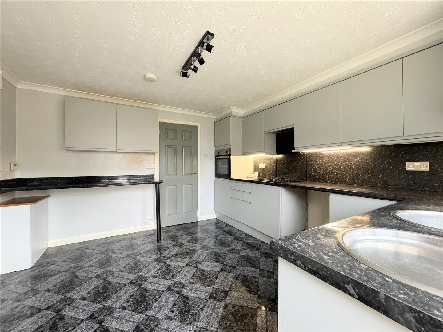 The kitchen at the rear is bright and spacious with a generous range of grey matte units with space for a washing machine, fridge freezer and an integrated eye level oven. From the kitchen there's a door to the rear garden. Within this room is ample space for a family sized dining table.