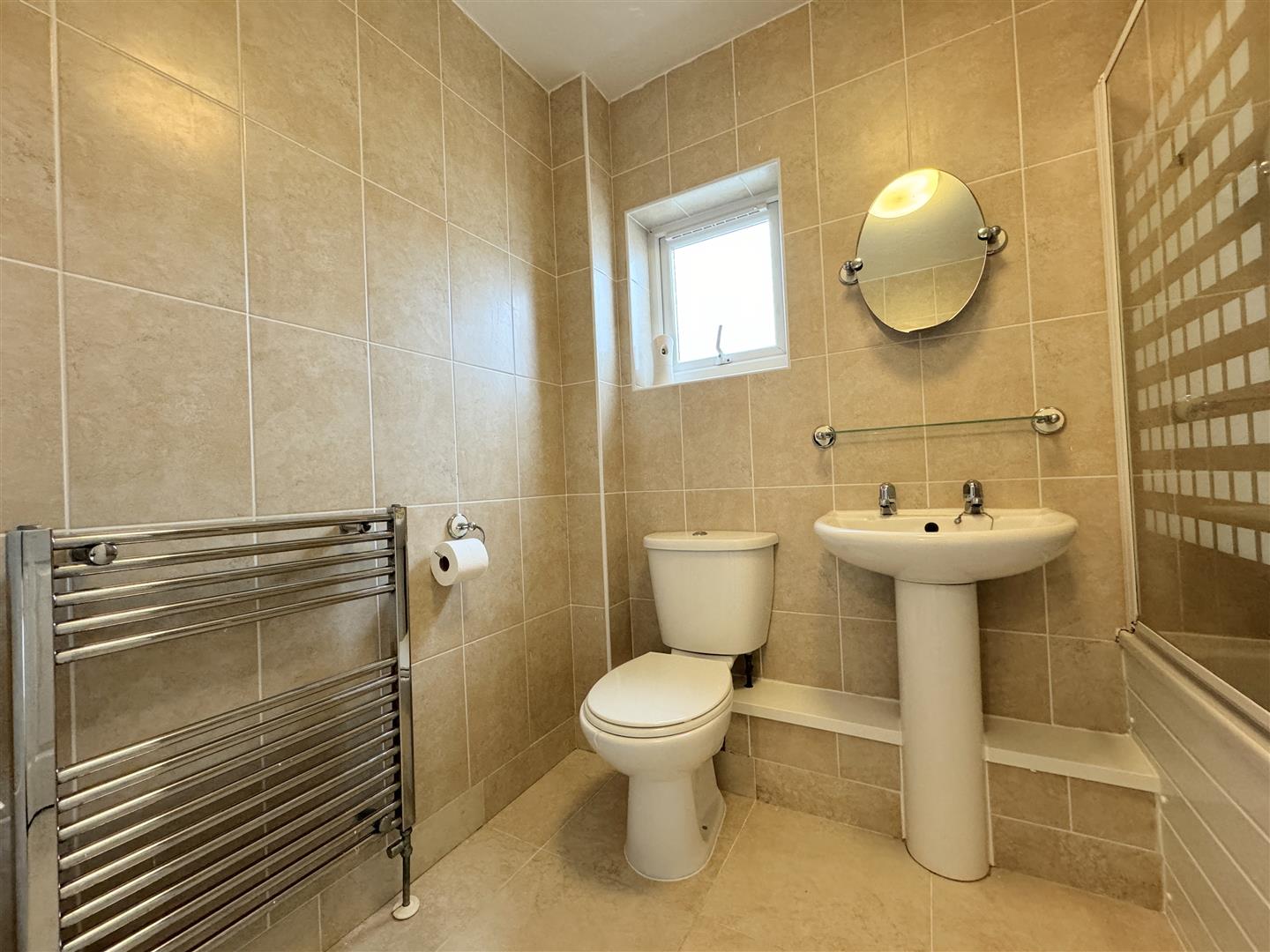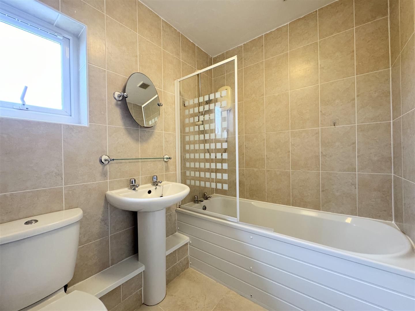 The bathroom is fully tiled with a bath and shower over. Also on the first floor, there's a useful storage cupboard housing the combination boiler