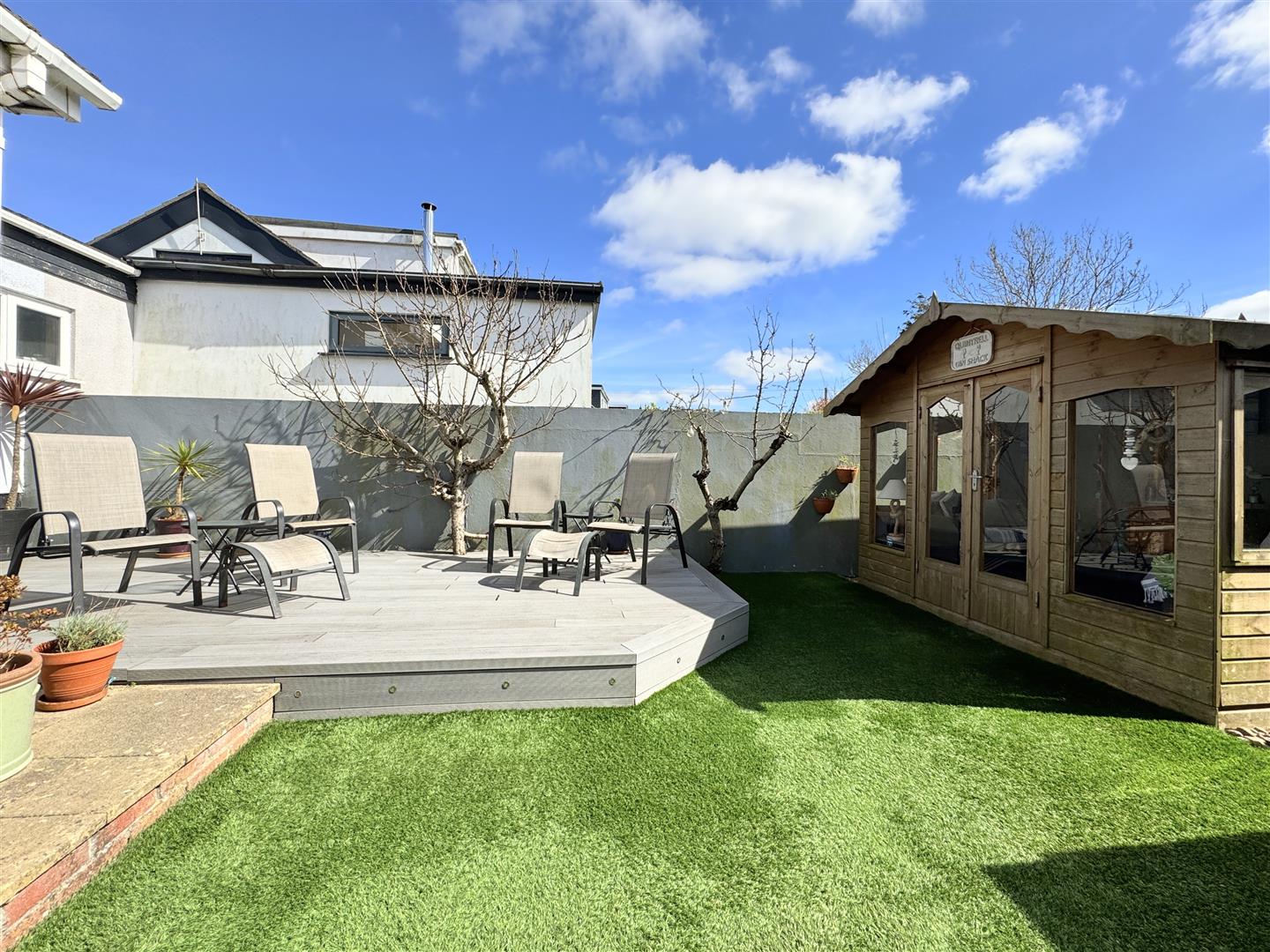 Outside, the wraparound garden offers a mix of lawns and decking, providing versatile spaces for relaxation and entertaining. A carefully positioned summer house adds flexibility as a garden room, home study, or additional storage. Parking is well catered for with a detached garage and driveway space for two vehicles.