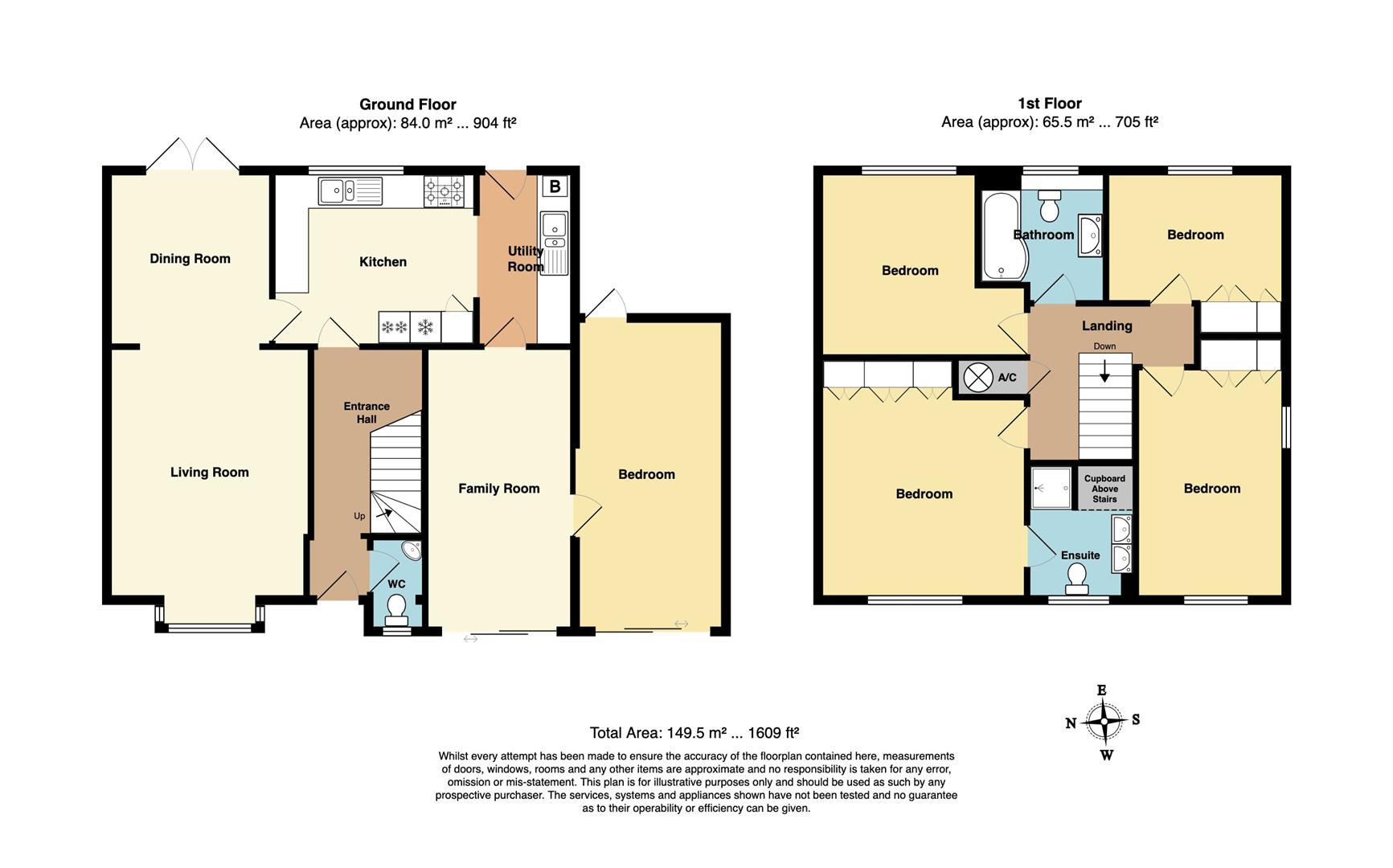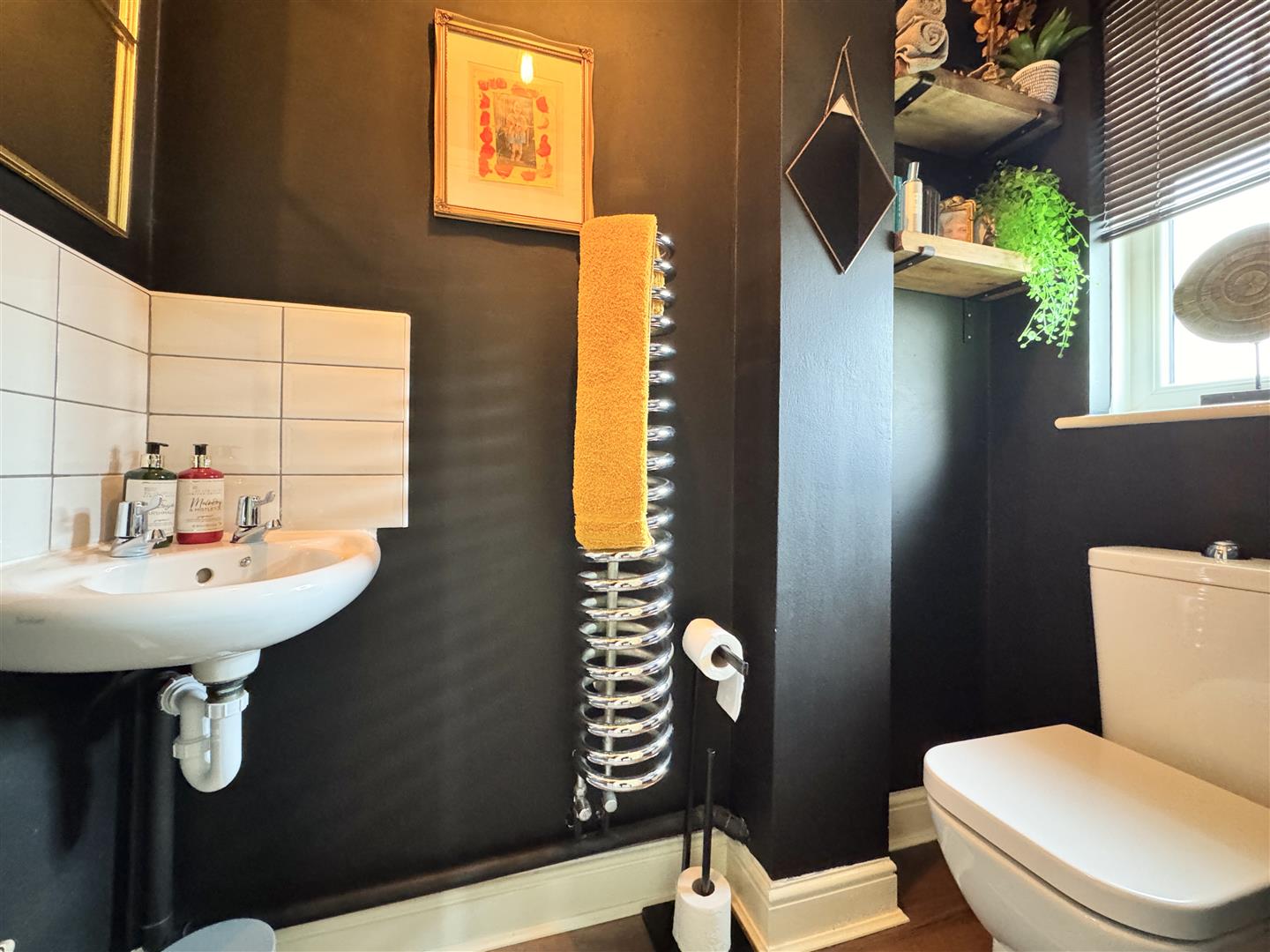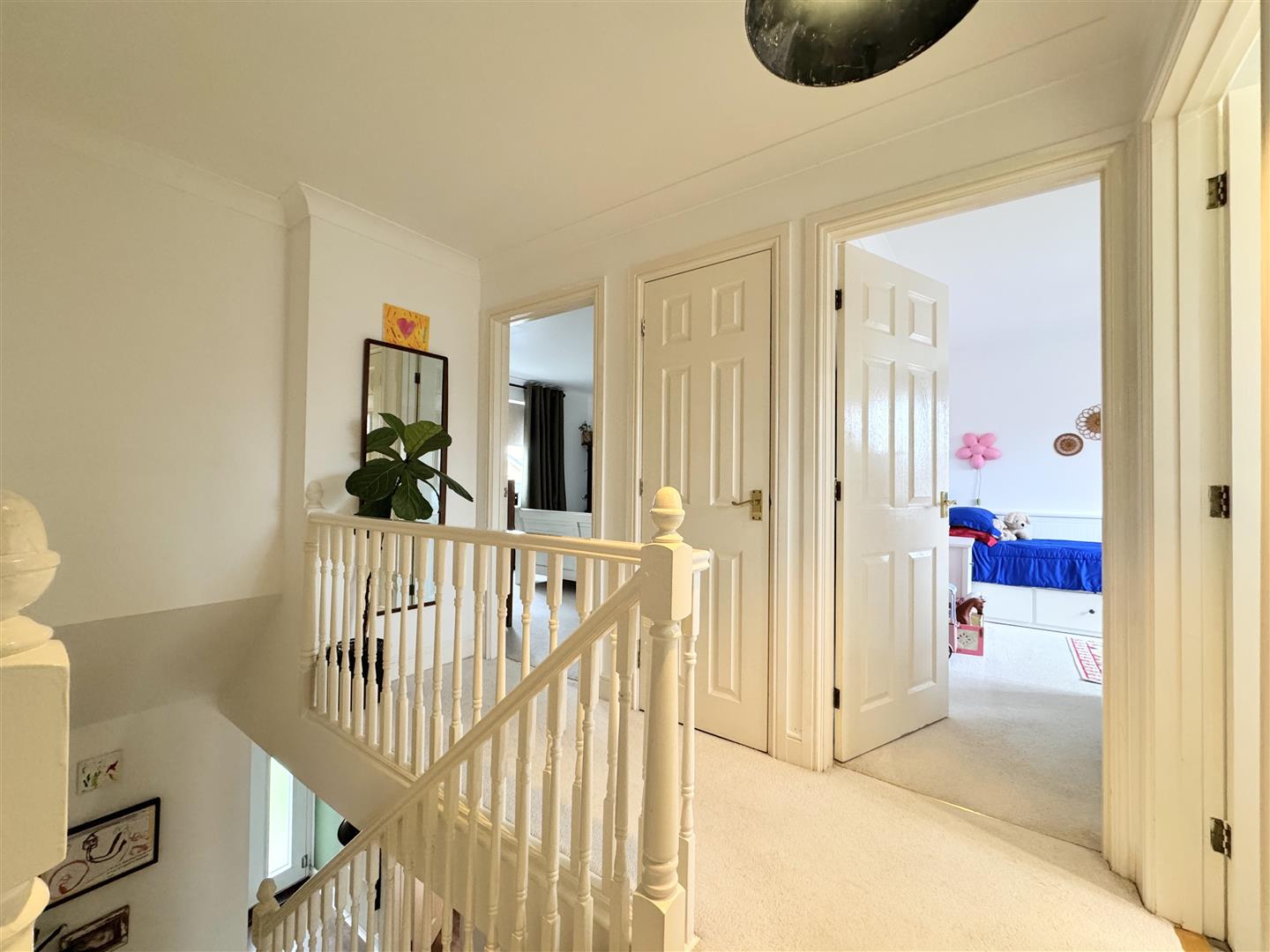 Upstairs, four generous double bedrooms provide excellent family space. The main bedroom benefits from built-in wardrobes and a stunning en suite shower room with spa-inspired styling — a luxurious retreat at the end of the day. The family bathroom is equally striking with gorgeous tiling, featuring a stylish P-shaped bath with shower over and elegant tiling. Additional practical touches include a partly boarded loft and a useful airing cupboard.