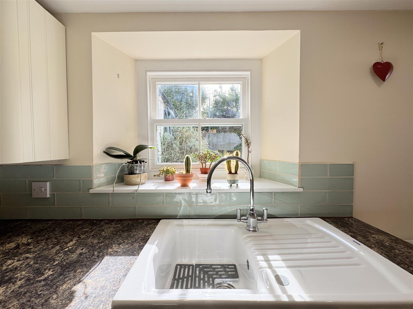 At the rear, you will find the well appointed kitchen featuring an extensive range of cream shaker-style units, a traditional Belfast sink, stylish tiled splashbacks, and a window overlooking the garden. There’s space for a fridge, dishwasher, and washing machine, with an integrated oven and gas hob providing everything you need for modern living.