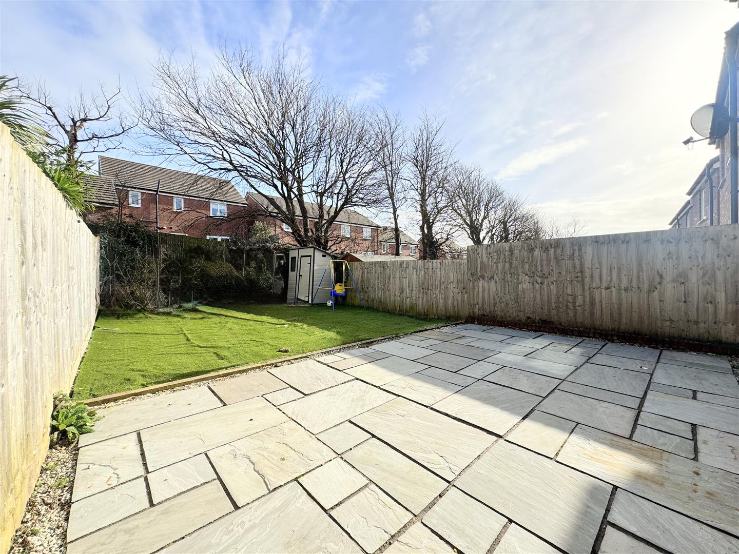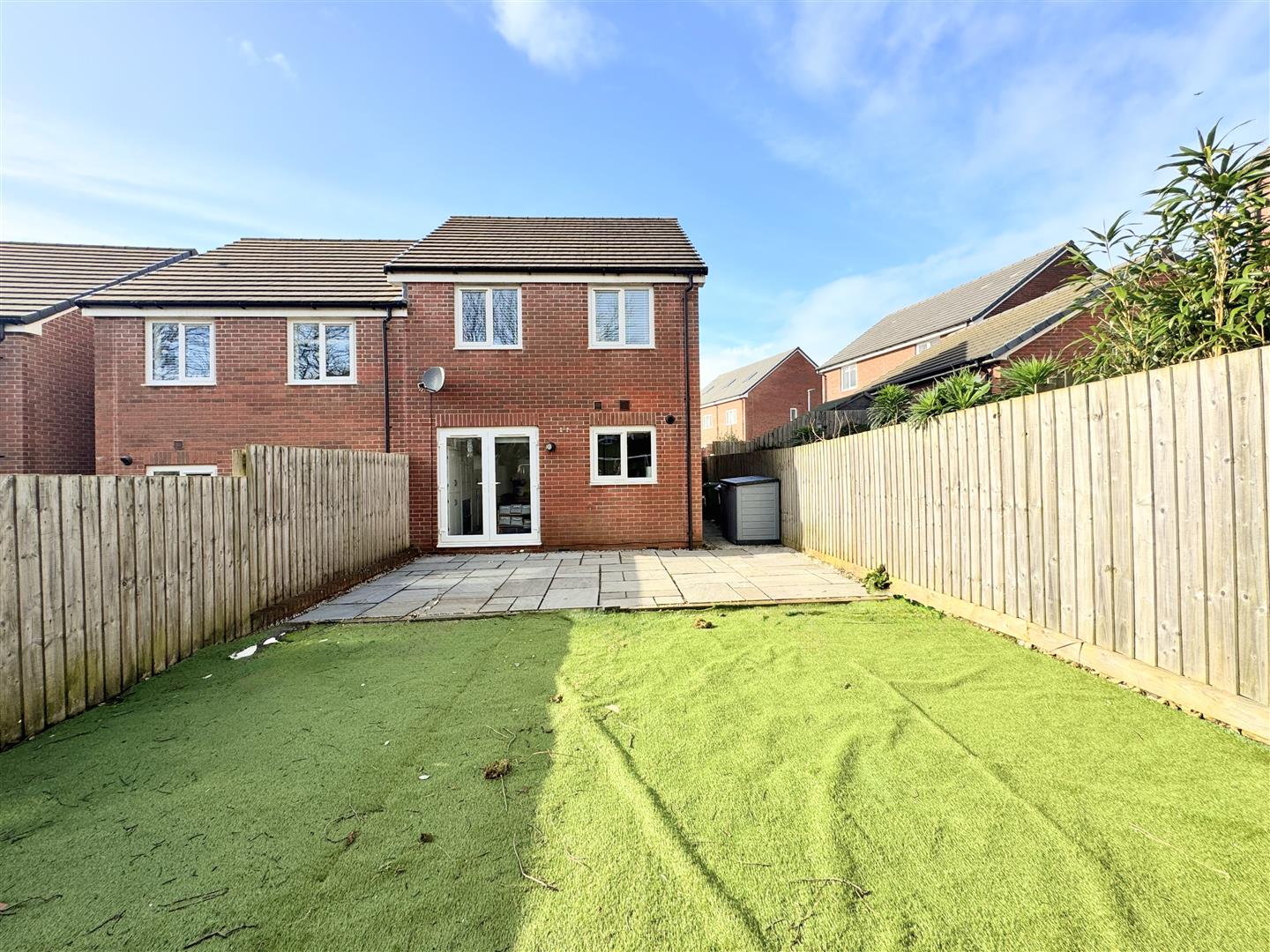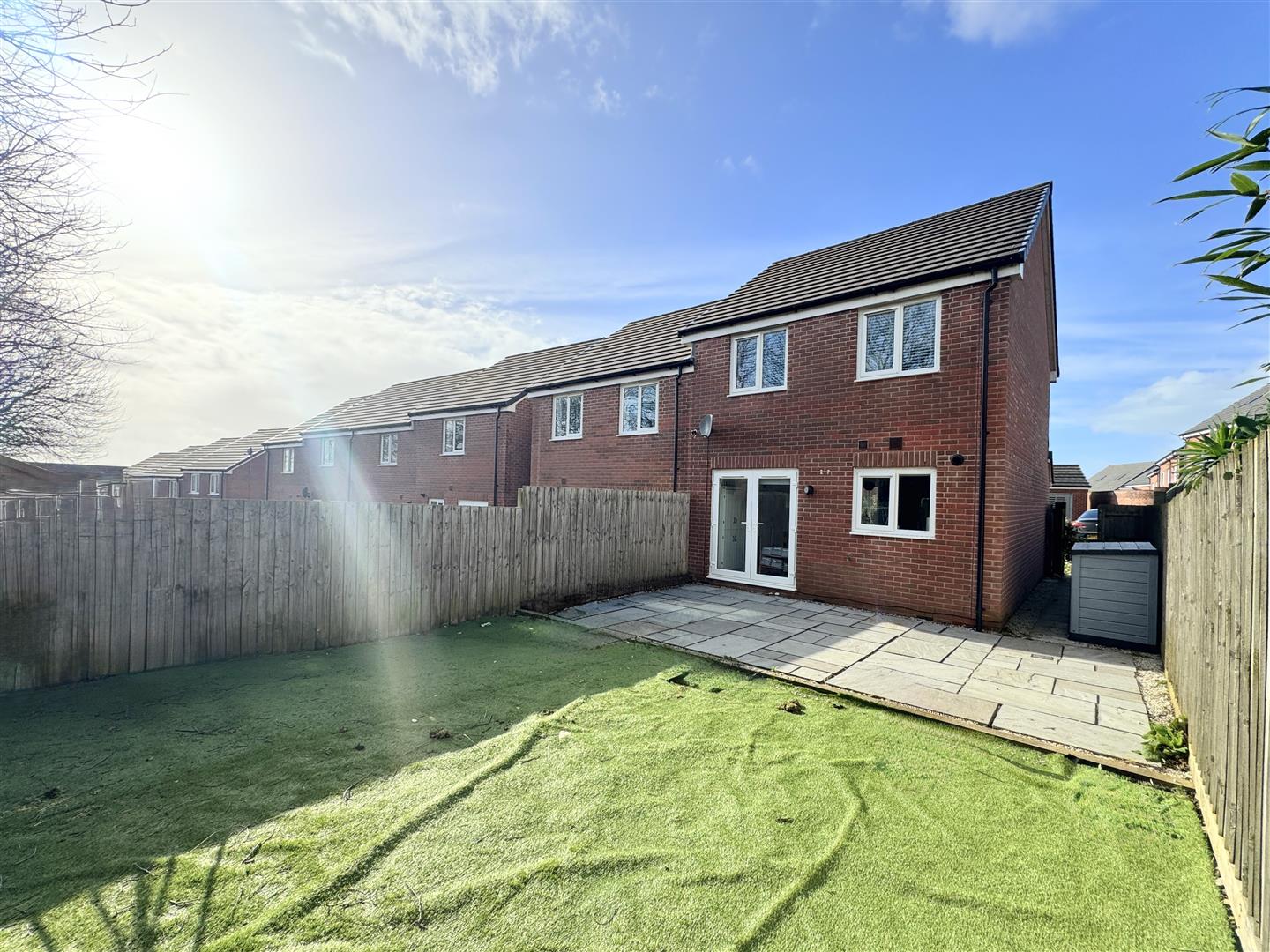 Externally, the property continues to impress. To the front is a double driveway—an unusual and highly desirable feature within The Goldings—with side access leading to the rear garden. The rear garden has been thoughtfully landscaped and features an extended patio, a large area of low-maintenance artificial lawn, and high fencing providing excellent privacy. A wide side area offers practical space for bin storage.