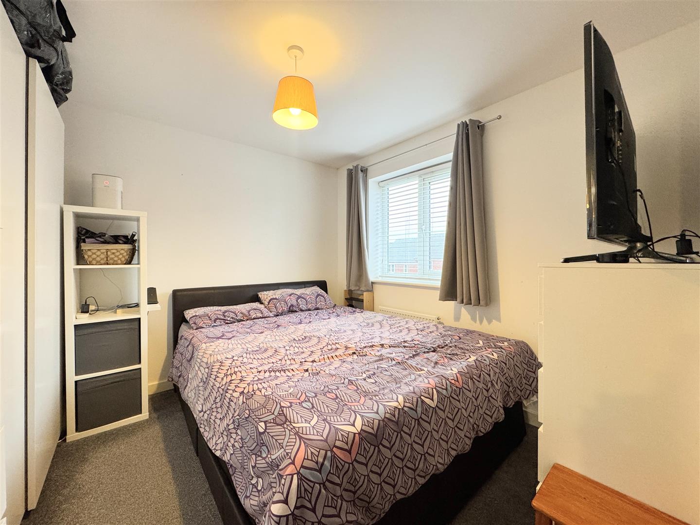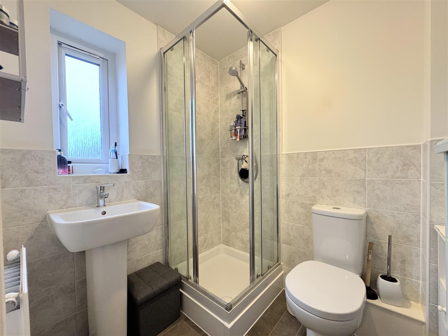 The first floor hosts all three bedrooms, comprising two well-proportioned doubles and a single bedroom. The main bedroom benefits from a beautifully appointed en-suite shower room, while the family bathroom is immaculately presented with a bath and shower over, complemented by stylish grey tiling. Throughout the property, the presentation is immaculate, with high-quality flooring and décor evident in every room. The home has clearly been lovingly maintained since new and still benefits from the remainder of its 10-year new home warranty, offering additional peace of mind.