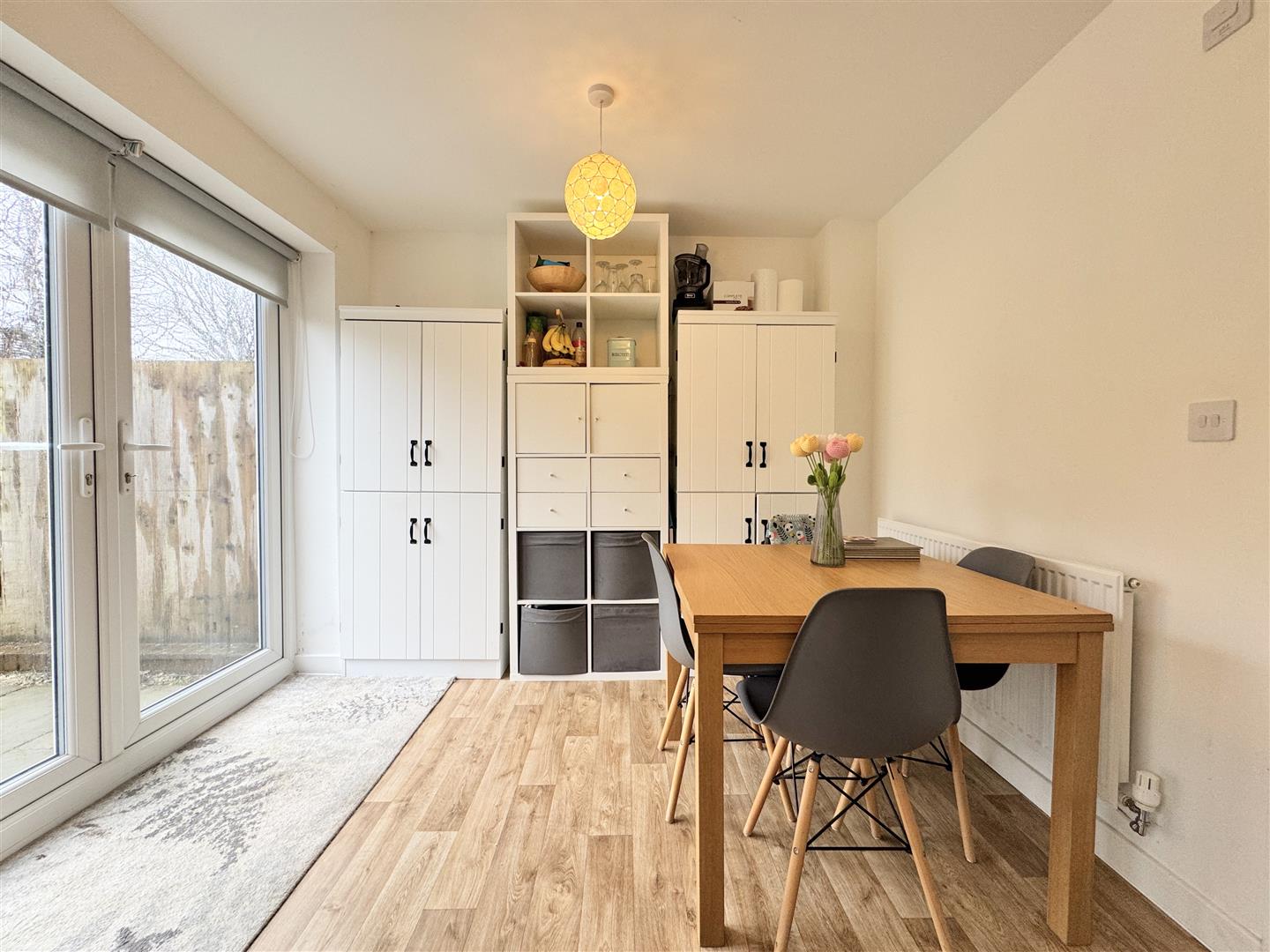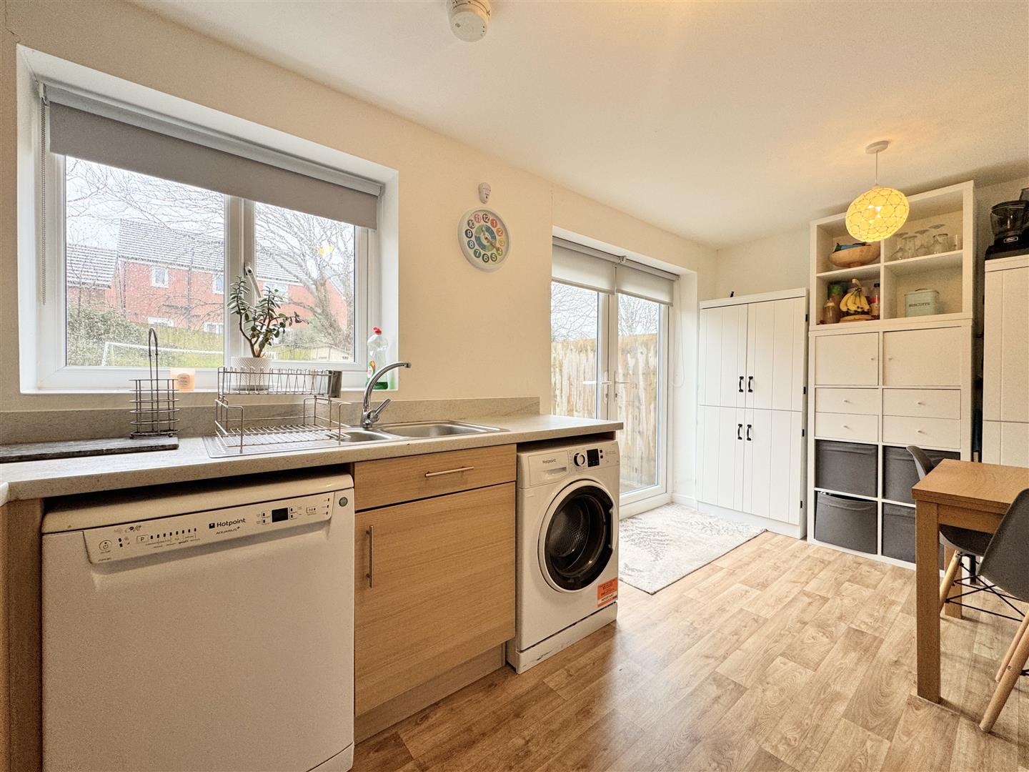 To the rear of the home is the impressive kitchen/diner—a superb, family-friendly space with direct access to the garden. It is well equipped with an excellent range of light wood effect units and space for free-standing appliances including an oven, hob, extractor, washing machine, dishwasher and fridge freezer. This versatile room works perfectly for everyday living, relaxing and entertaining. The dining area, filled with natural light from the patio doors, comfortably accommodates a family-sized table, and when the doors are open, the generous patio becomes a seamless extension of this social space.