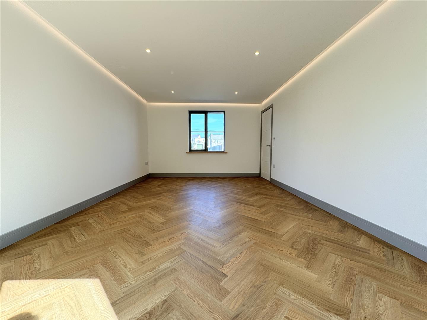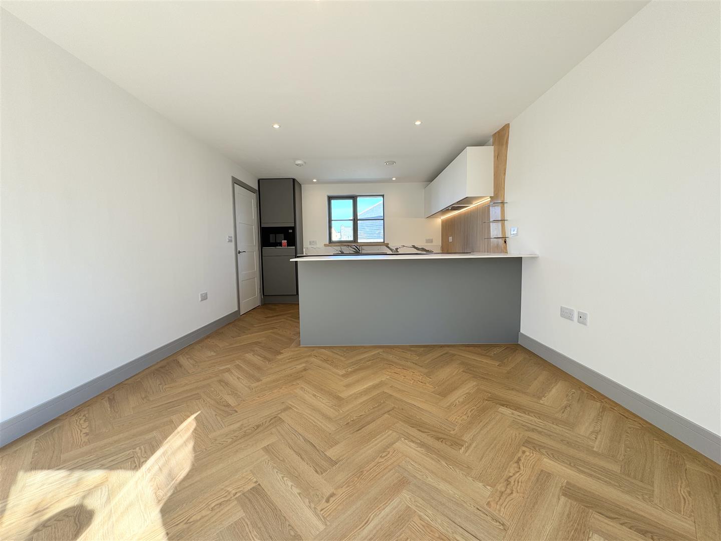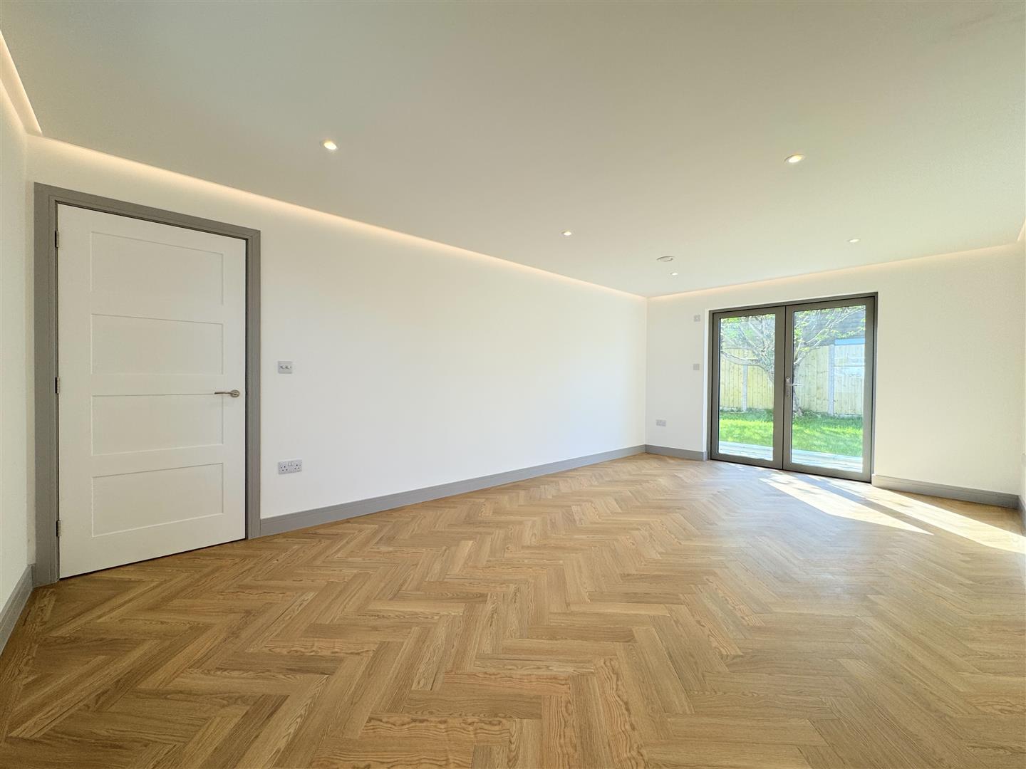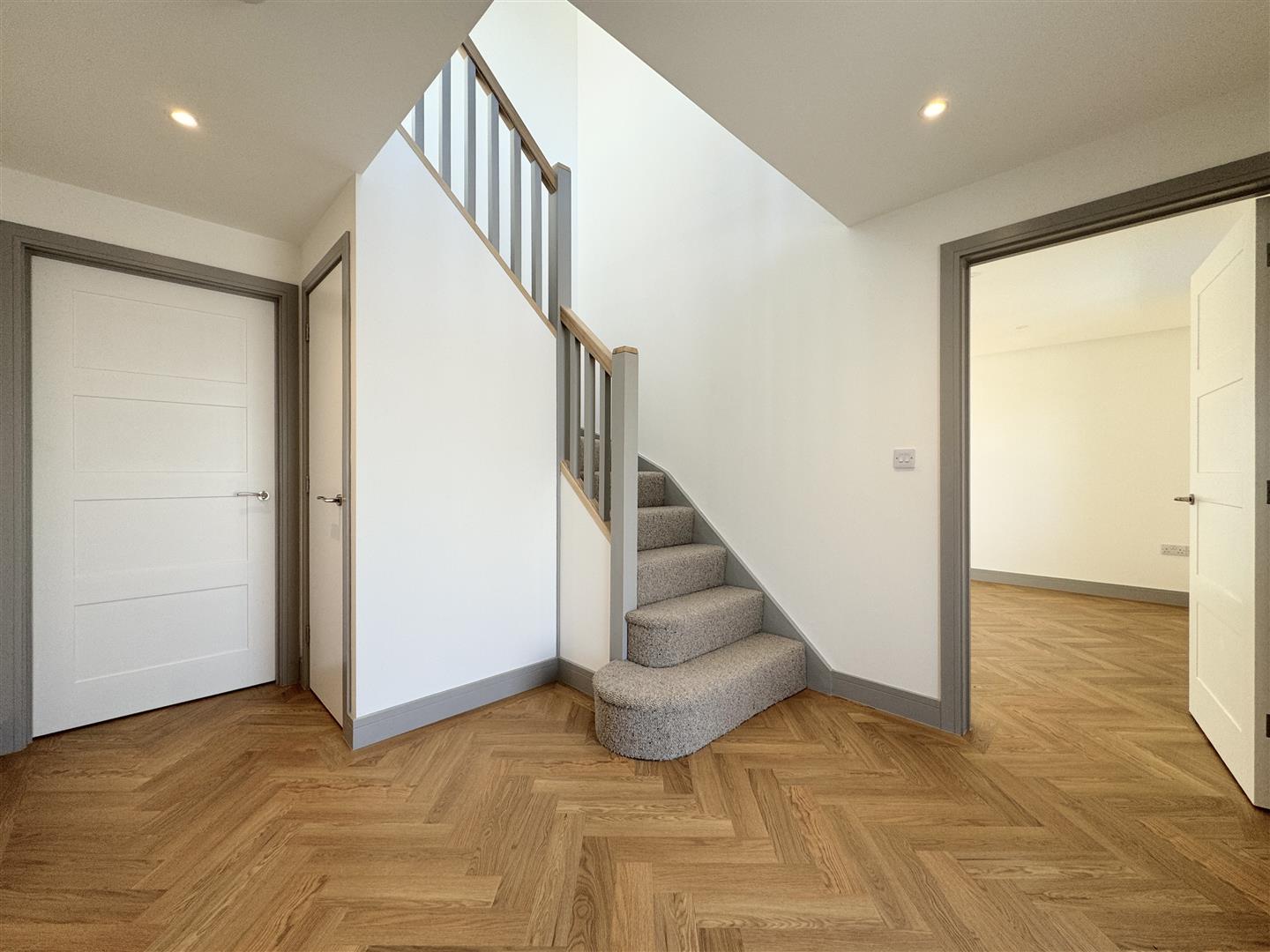 On the other side, you will find the living room, a brilliant family room with a window to the front and double doors opening into the garden. A false ceiling with LED lighting adds to the stylish feel of this room. The whole of the ground floor is finished with herringbone Amtico LVT flooring, perfect for those muddy paws and boots! Also on the ground floor, there's a utility room, useful WC and plenty of storage.