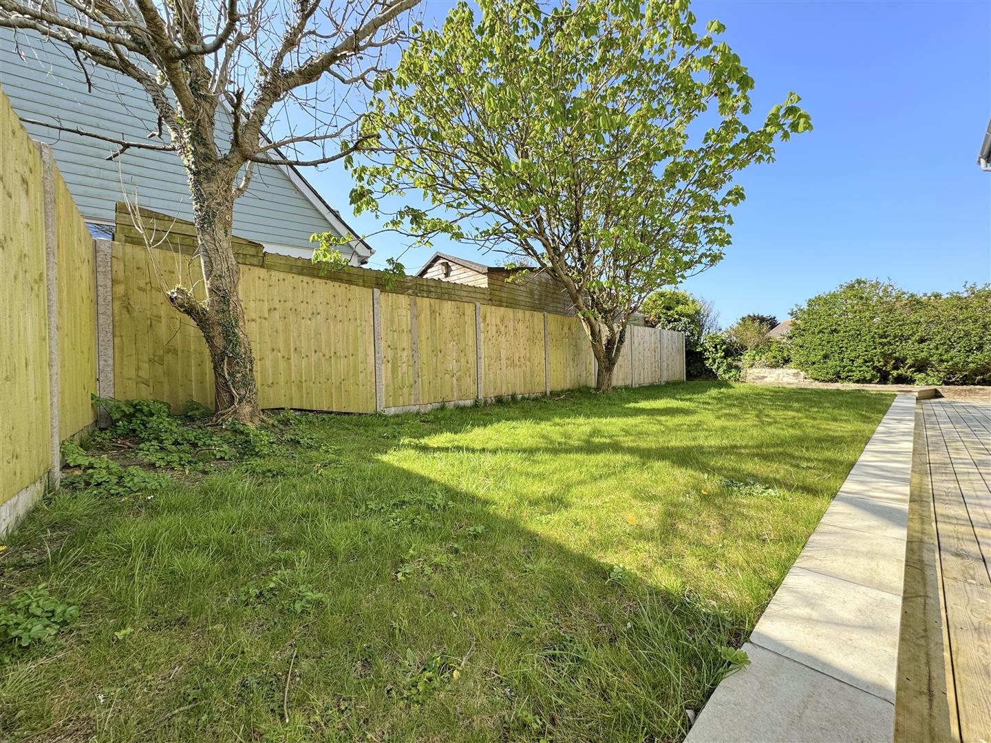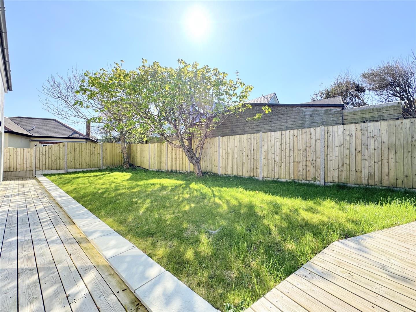 The garden at the rear is laid mainly to lawn and is southerly facing enjoying all day sun and a good degree of privacy. There's a neat decked area off from the loune and dining areas and some well established plants and trees with access down both sides to the front. At the front, there's a long gravelled driveway leading to the property with ample parking.
