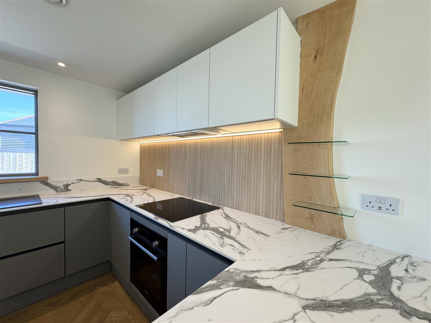 The dual aspect kitchen diner on the left exudes luxury with a vast range of contemporary units finished with a high quality work top. Practically, there's an integrated fridge, microwave, freezer, dishwasher and electric oven and hob. A breakfast bar loosley splits this space offering a casual dining spot, perfect for brekfast on the run! With the rear doors open, the garden really is an extension of the dining area, perfect for summer entertaining.