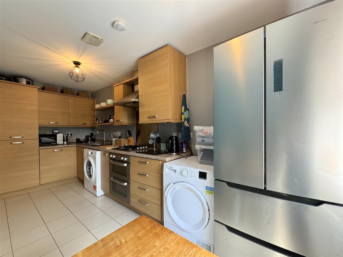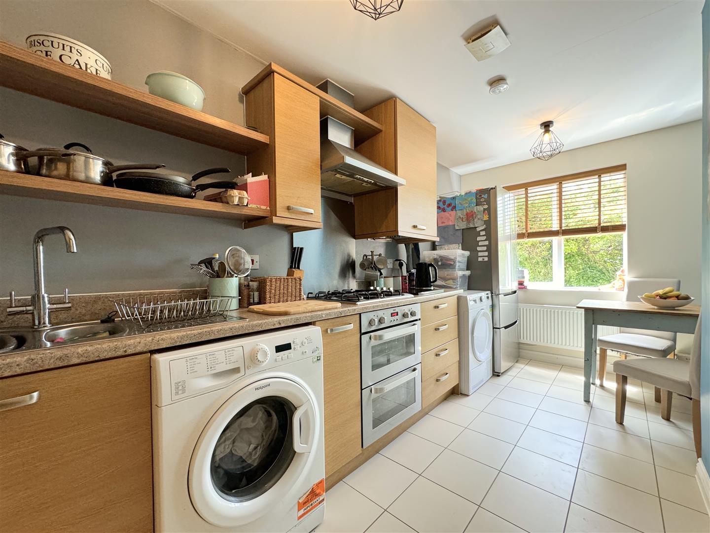 An entrance hallway with a cloakroom gives access to the kitchen which is at the front of the property enjoying a westerly aspect The kitchen has a generous range of modern oak effect units with an integrated double oven, gas hob and space for a fridge freezer, tumble dryer and a washing machine. Within the kitchen there is space for a dining table.