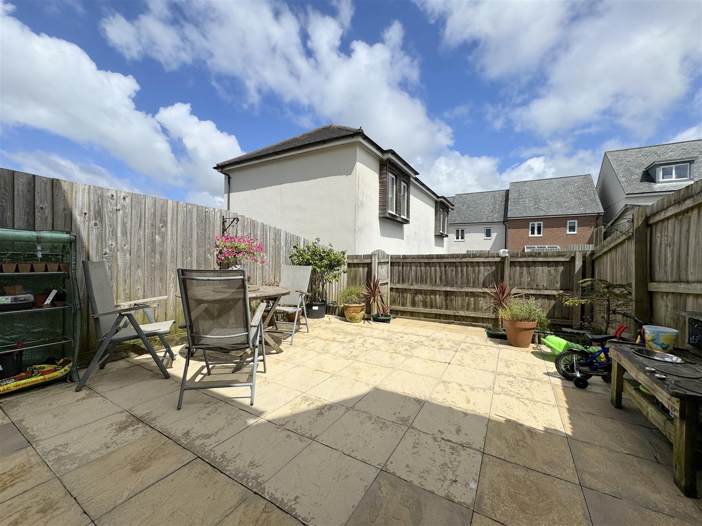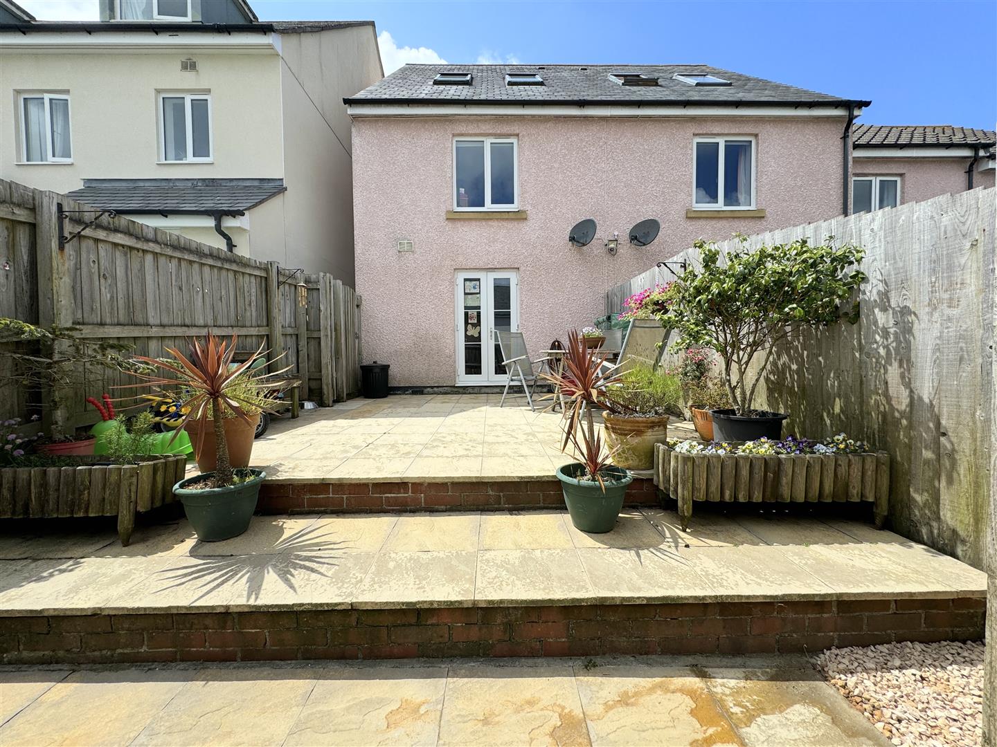 Externally, the garden at the rear is neat and low maintenance, laid completely with patio slabs with some attractive raised beds. At the rear of the garden, there's allocated parking and a single garage.