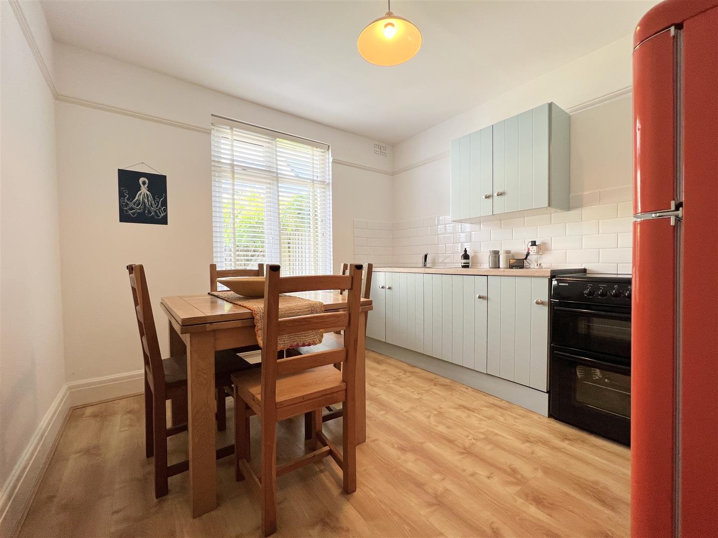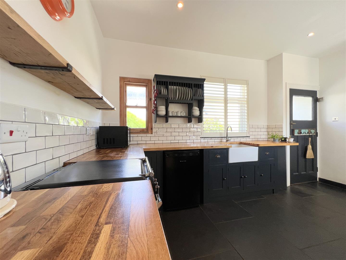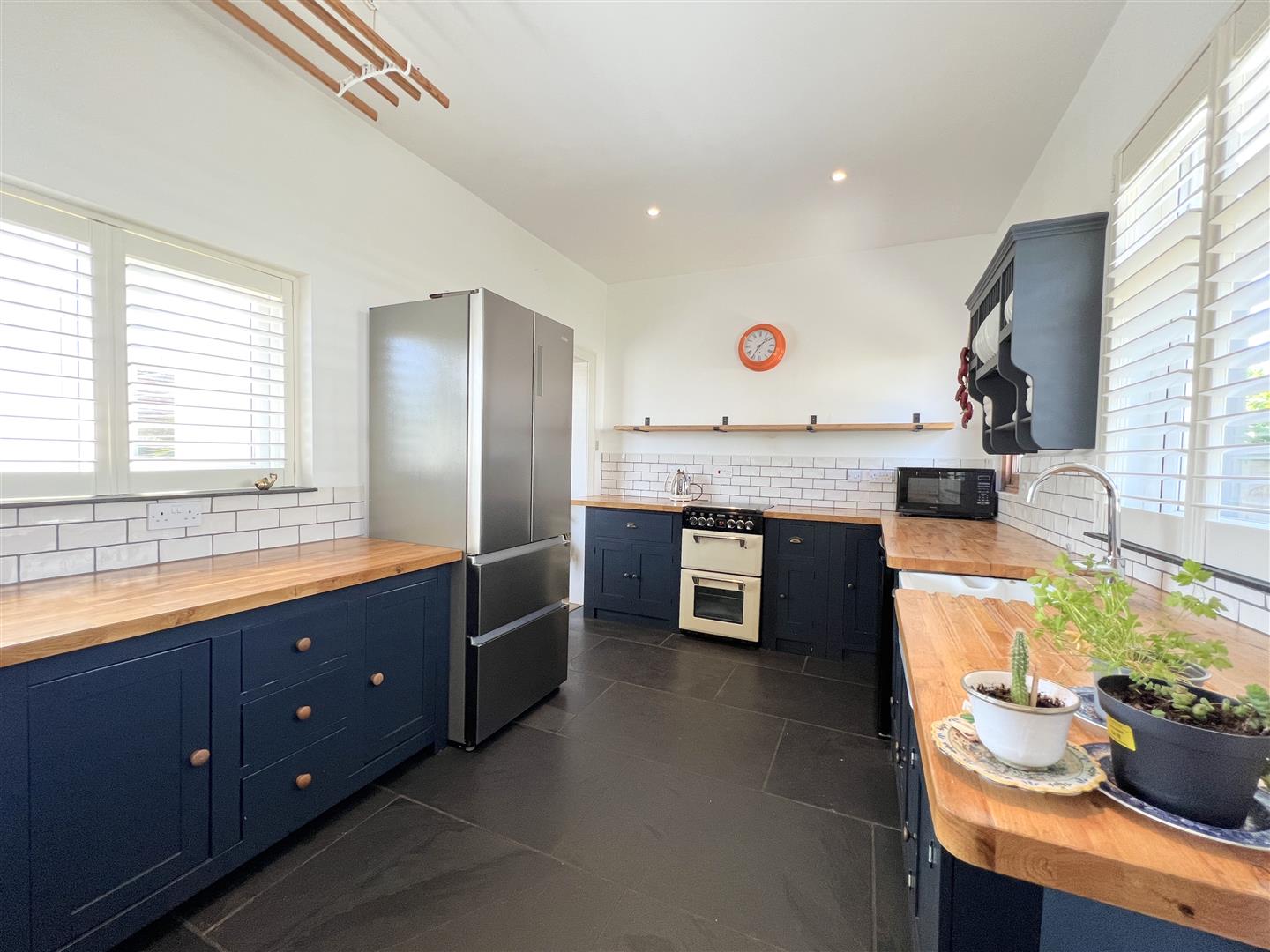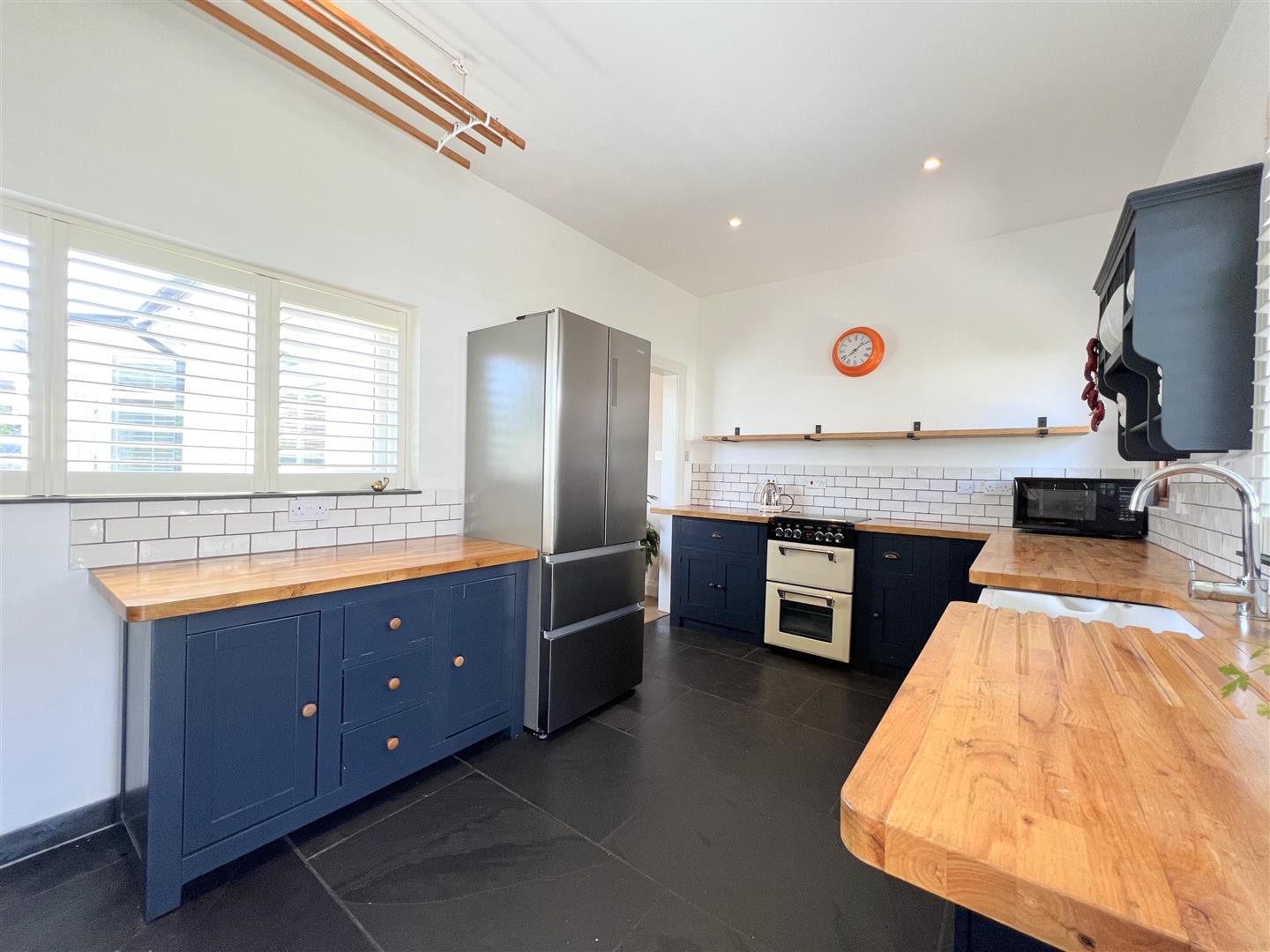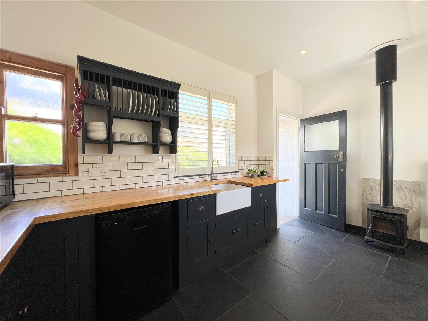 At the rear, the dining room which has a log burner flows seamlessly into the kitchen which has a pantry and a door to the rear. This area is great for families and encourages connection, ideal for those with younger children and perfect for social occasions. Practically, the dual aspect kitchen offers a good range of navy blue cupboards with a slate floor and Belfast sink. There's space for an oven and fridge freezer.